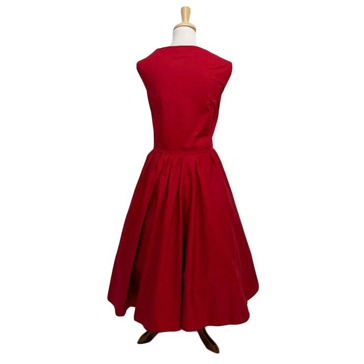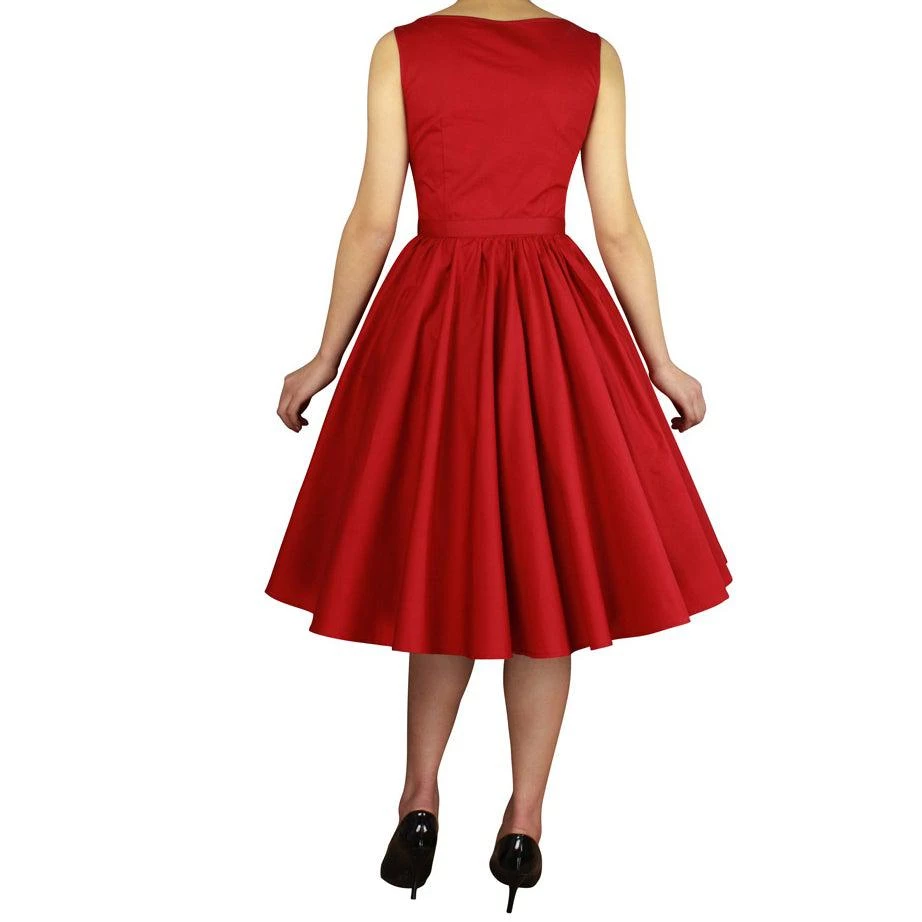 The Bella classic swing dress in cherry red will be an instant favorite! The sweet sleeveless dress has a boatneck cut, a nipped-in waist, a full gathered skirt, and an adjustable buckled belt. Add a petticoat for super swing!