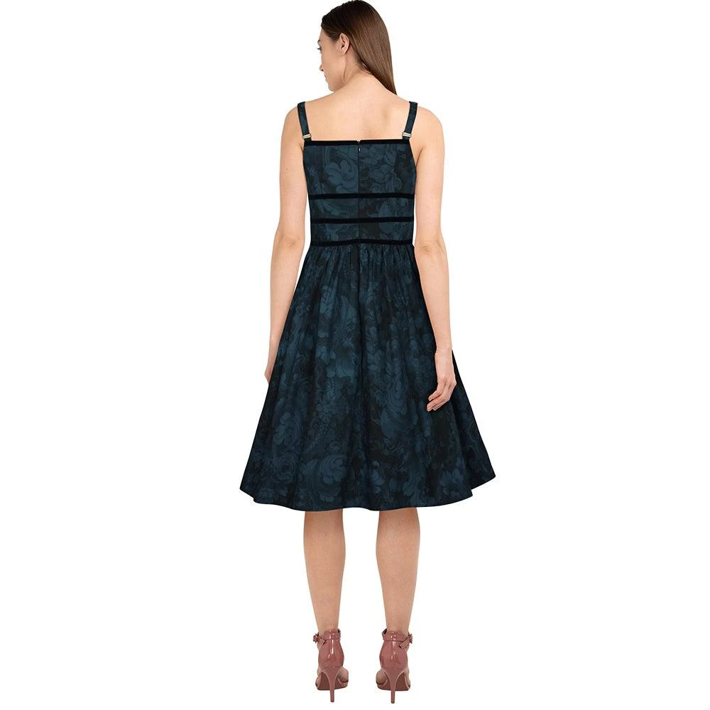 This floral-print stunner features black velvet trim and adjustable straps for a customizable fit, back center zip, and side seam pockets. Add a petticoat for that full fabulous flare!