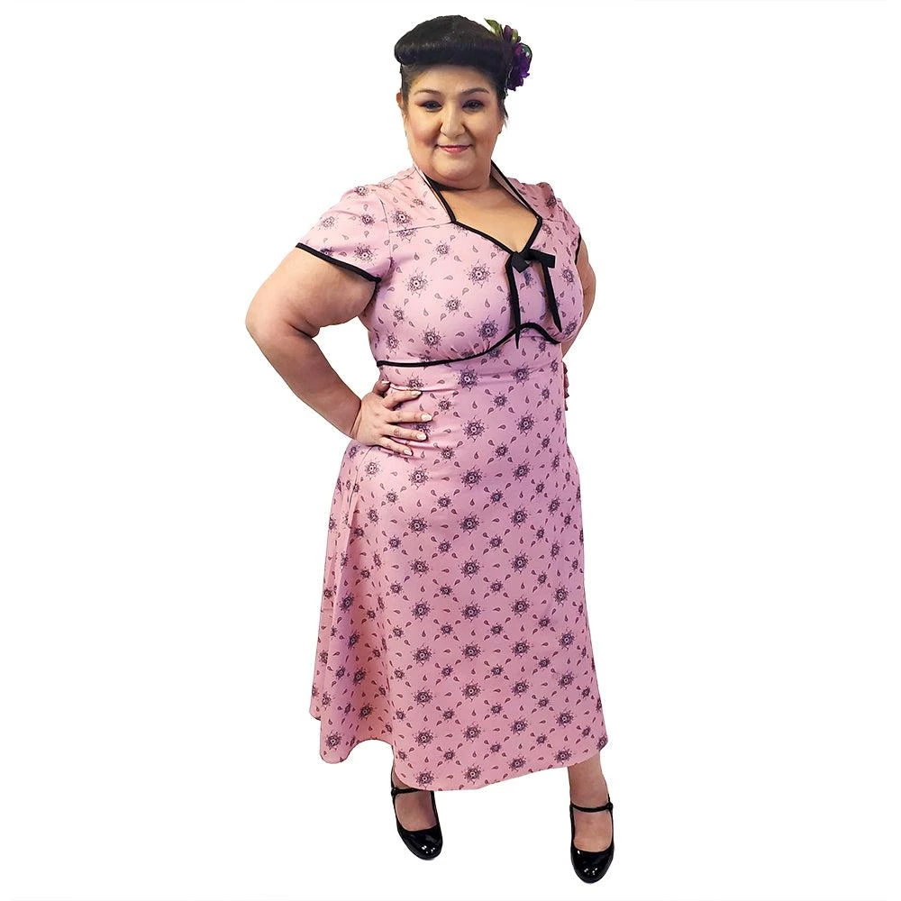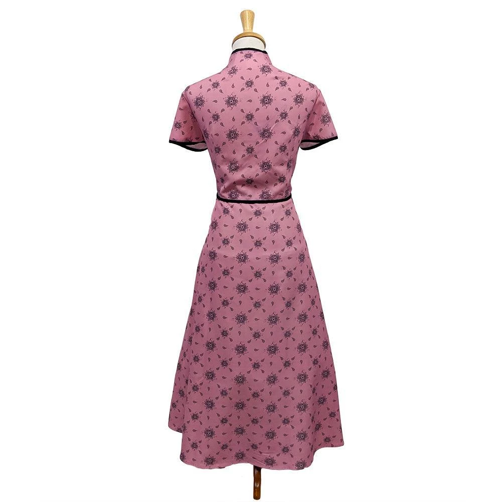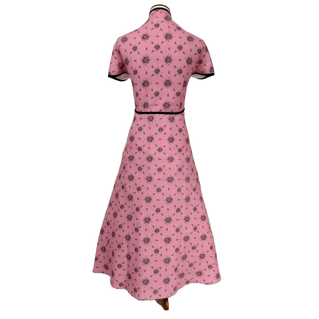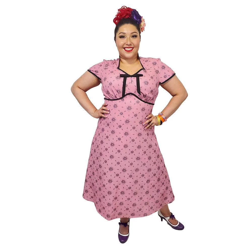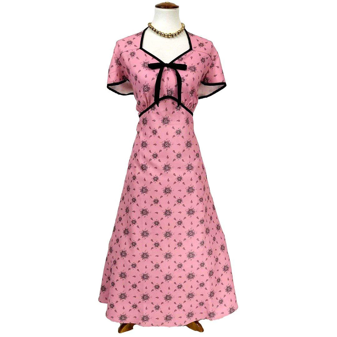 This easy care dress features a sturdy knit fabric with an intriguing black print on a pink background. It has raglan sleeves, a diamond neckline, the bust is gathered above a high waistline, and the A-line skirt is quite full. Features black piping details around the neckline, the sleeve edges, and at the waist, plus a sweet black bow in the center front.