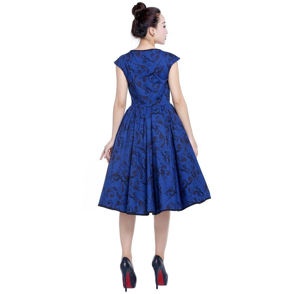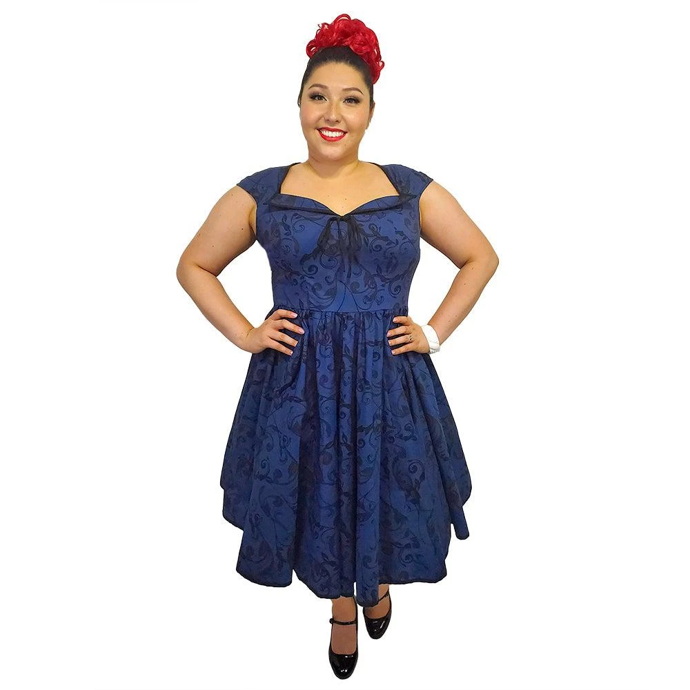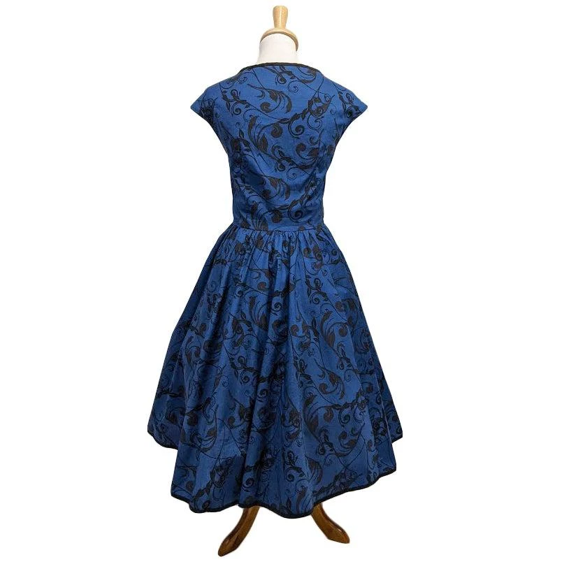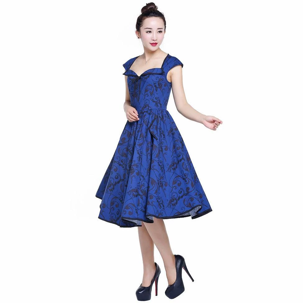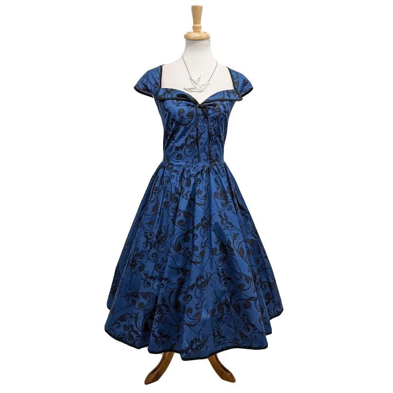 This sweet retro dress in blue & black floral features a flattering sweetheart bustline with fold-over detail outlined in black and tied in the center with a bow. It has flattering cap sleeves and a very full skirt that has deep pockets with fold-over diagonal flaps and a hem band trimmed in black. Side zip.Â