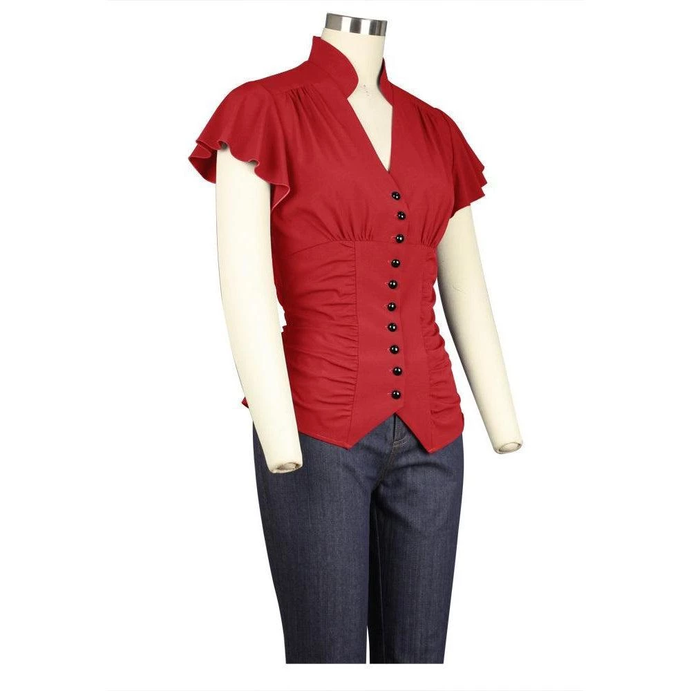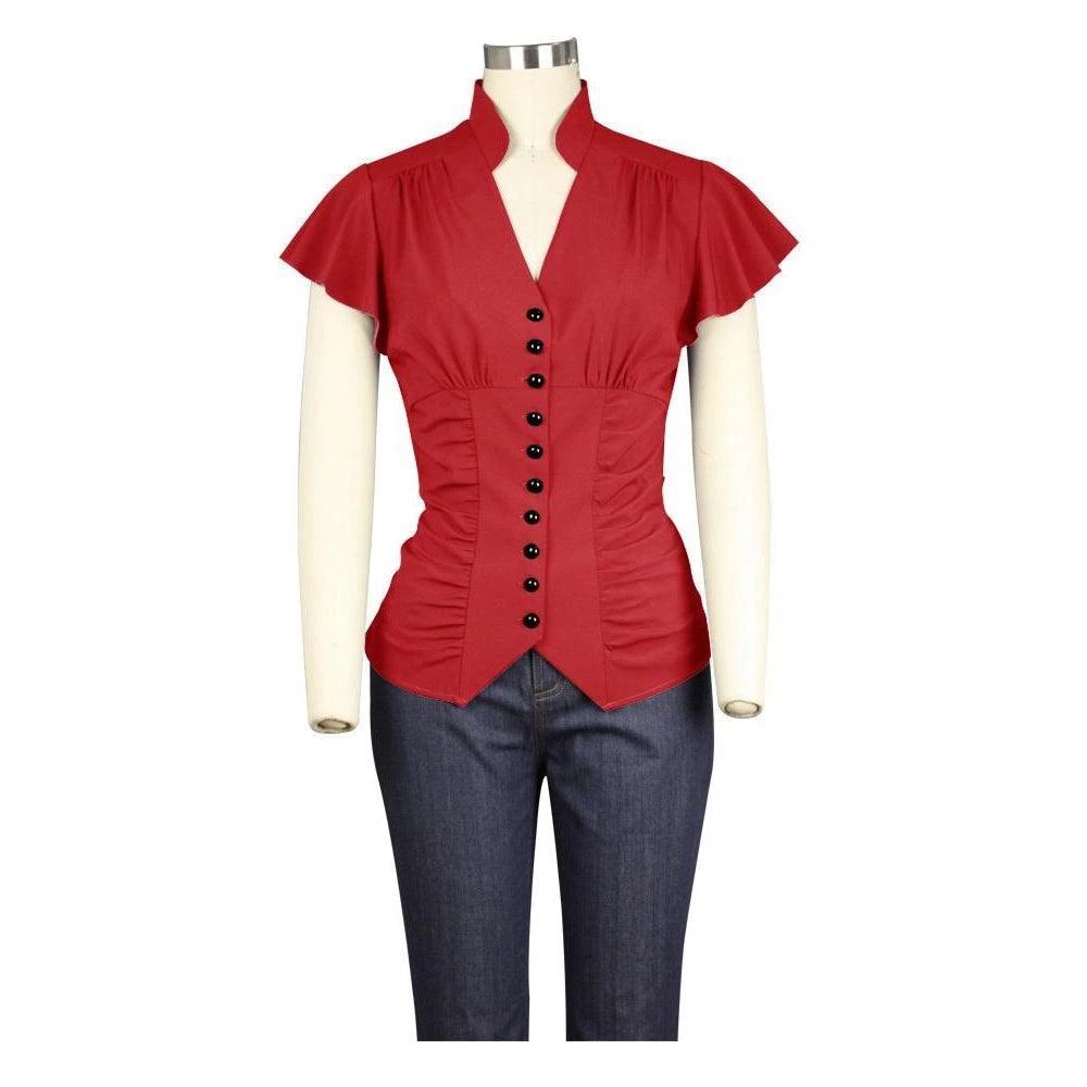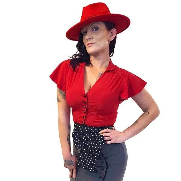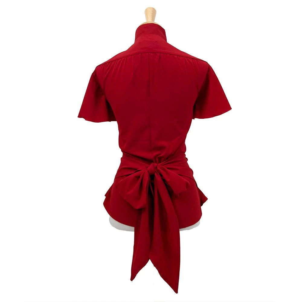 Put on some flattering forties in this lovely blouse. It has a high mandarin collar with a v-neck and pretty flutter sleeves. It gathers at the bust and shoulder seams, and the front closes with functioning shiny black buttons. The waist is inset with an attached waist band tied into a bow at the back. Â