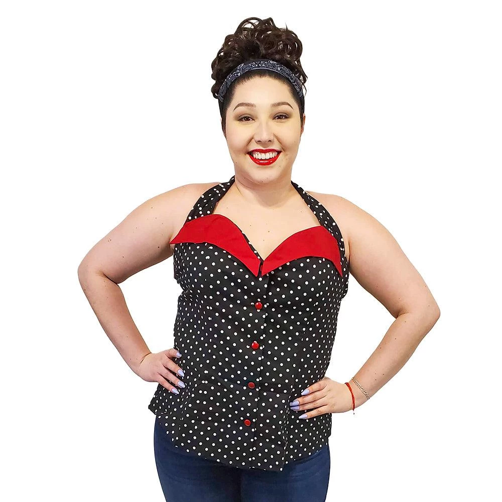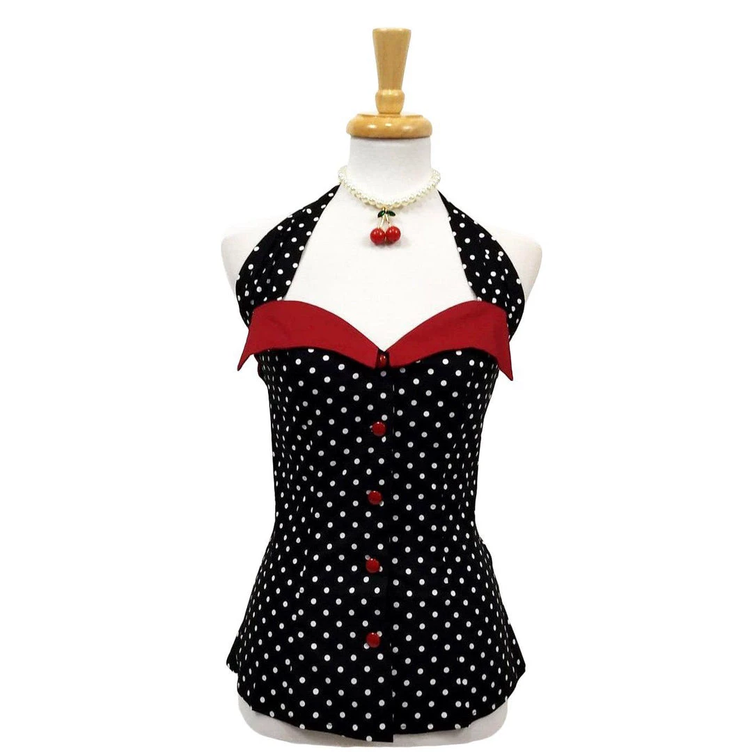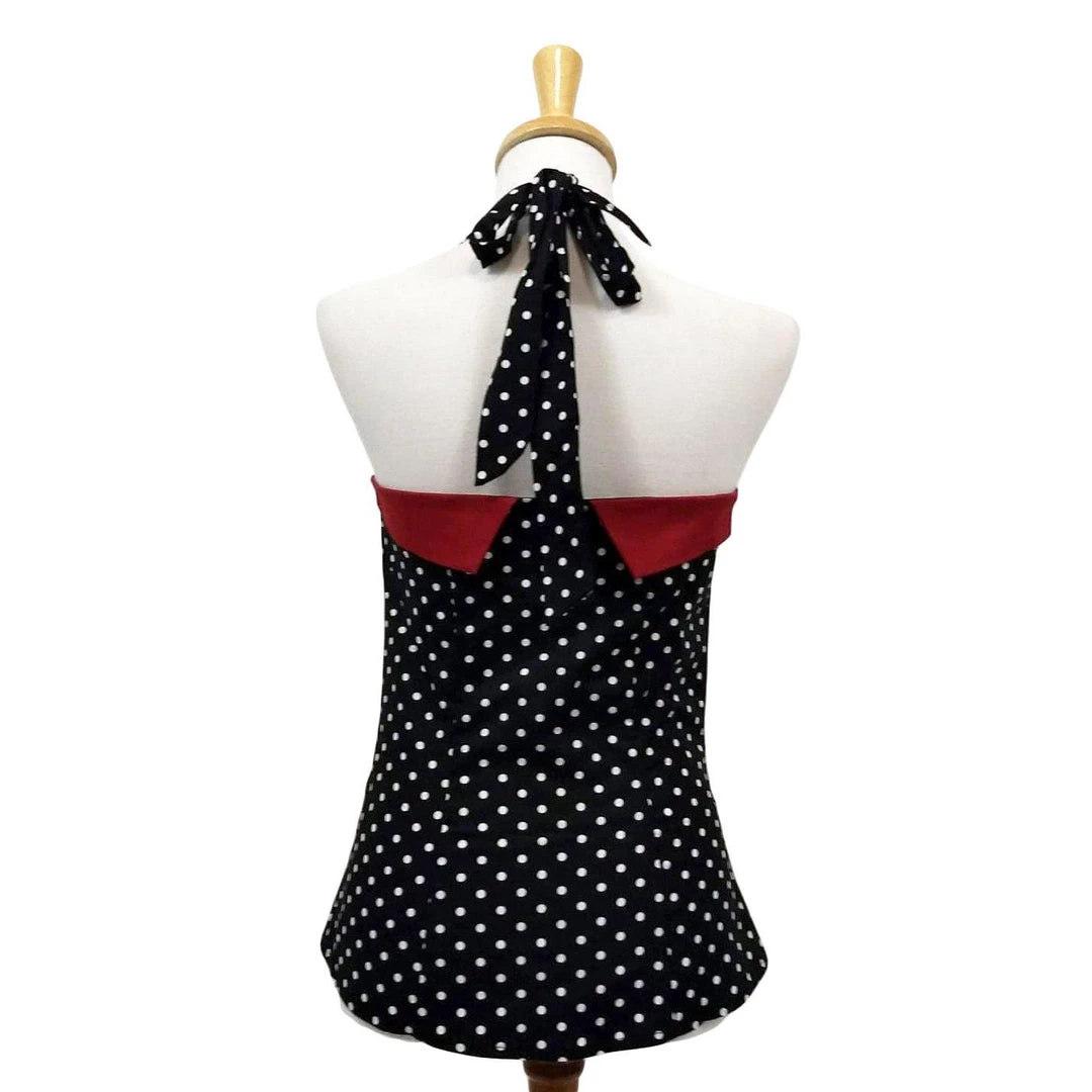 This pretty halter top in black with white polka dots has a sweetheart neckline with a red foldover in front and in back. The princess seaming gives a nice shape. It buttons up the front with red buttons, and has nice wide straps to tie at the back of the neck.