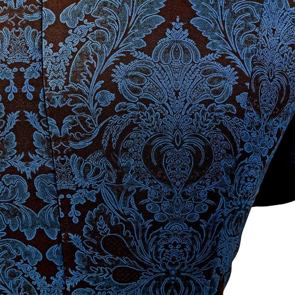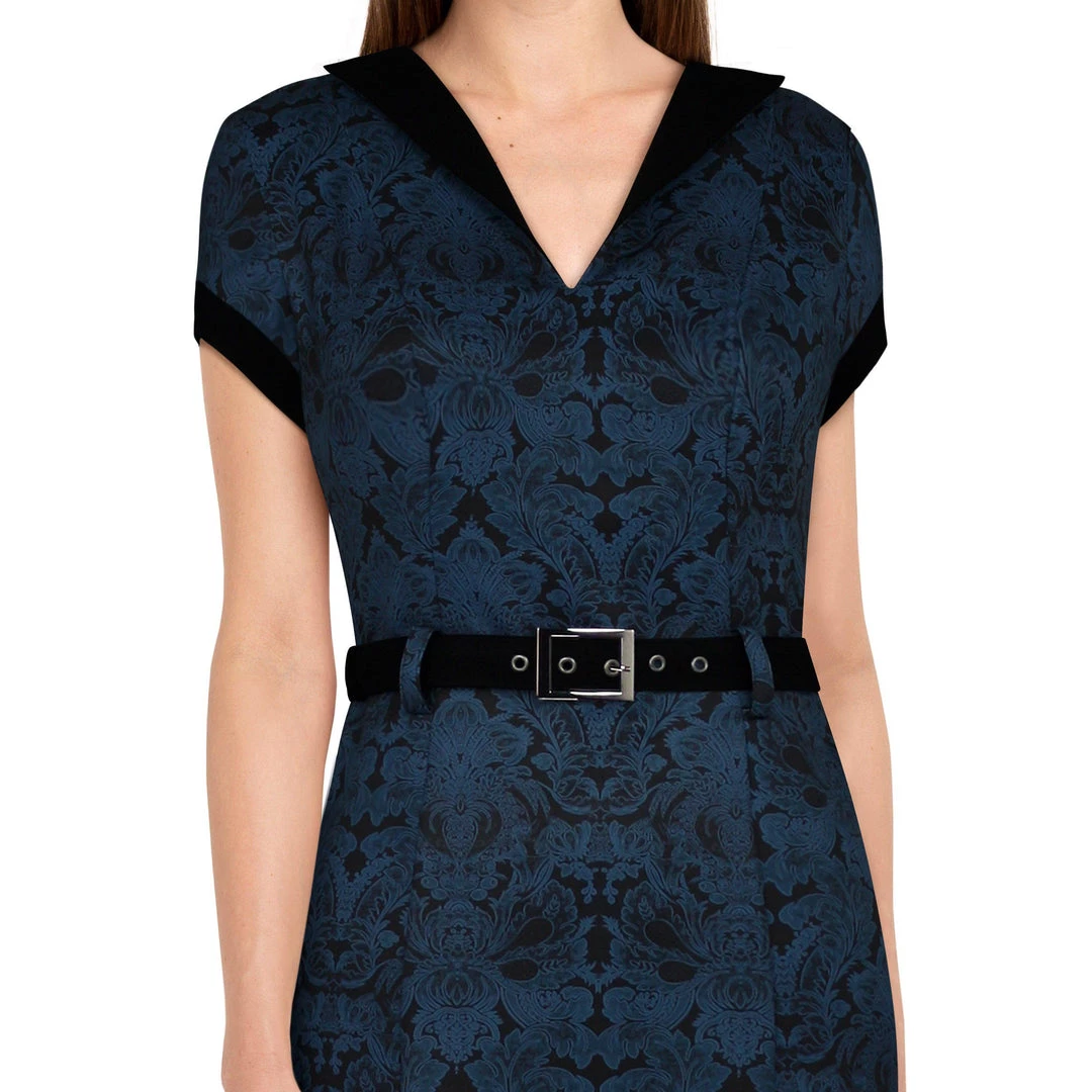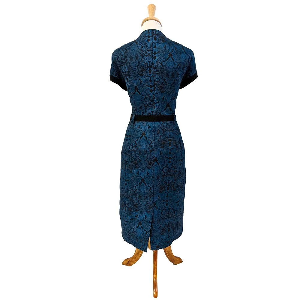 Featuring a gorgeous black haunted mansion pattern on a deep blue wiggle dress, this dress is amazing! It has a deep v-neck, a black collar, and black sleeve cuffs. The dress comes with a matching black belt and has a zipper up the back.