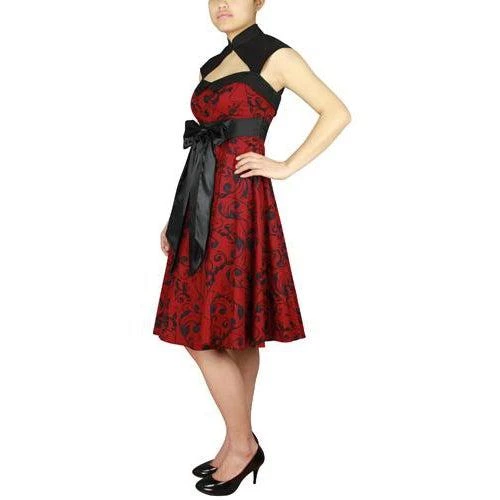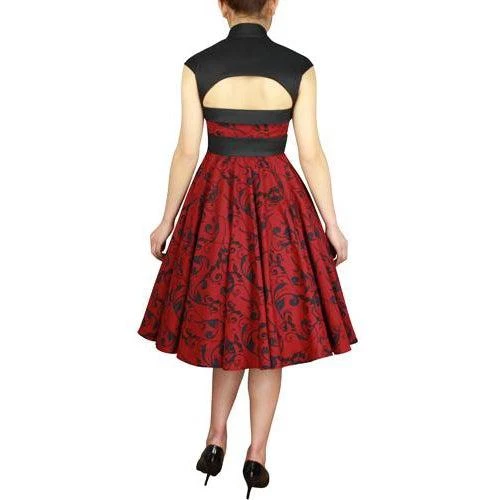 This fantastic dress has a formal edge with its little black bolero-esque top and a super full swing skirt finished with a huge satin bow. A voluptuous peekaboo styling is accomplished with cutouts on the decolletage and across the upper back of the bolero, which has a mandarin collar fastened with a hook and barely-there cap sleeves. The main body of the dress is a beautiful scroll print in black on a deep red background. The bodice has a fold-over collar in black, is nipped in at the waist, and features 3 big black buttons down the front. Perfect for a night at the theater!!