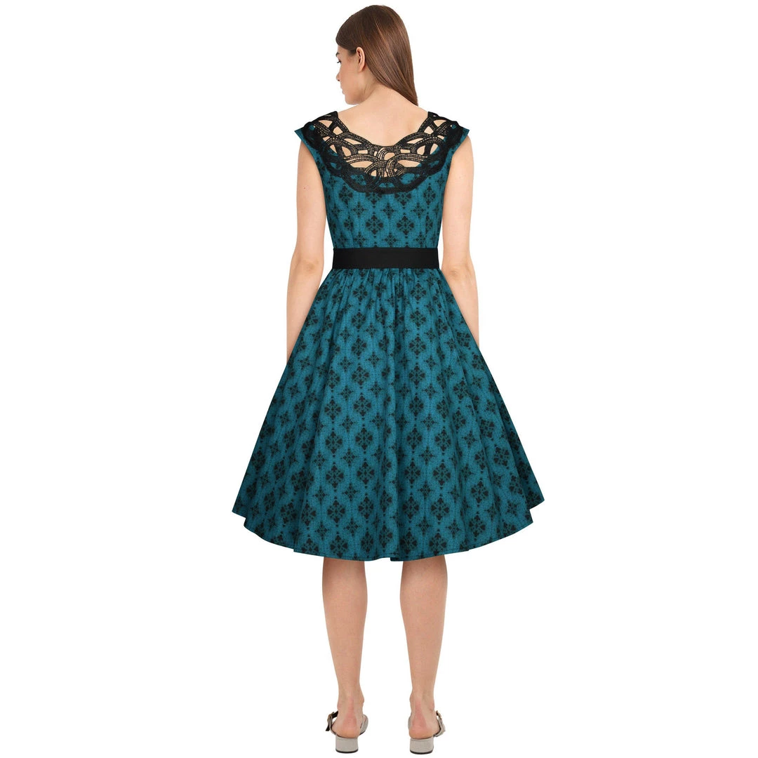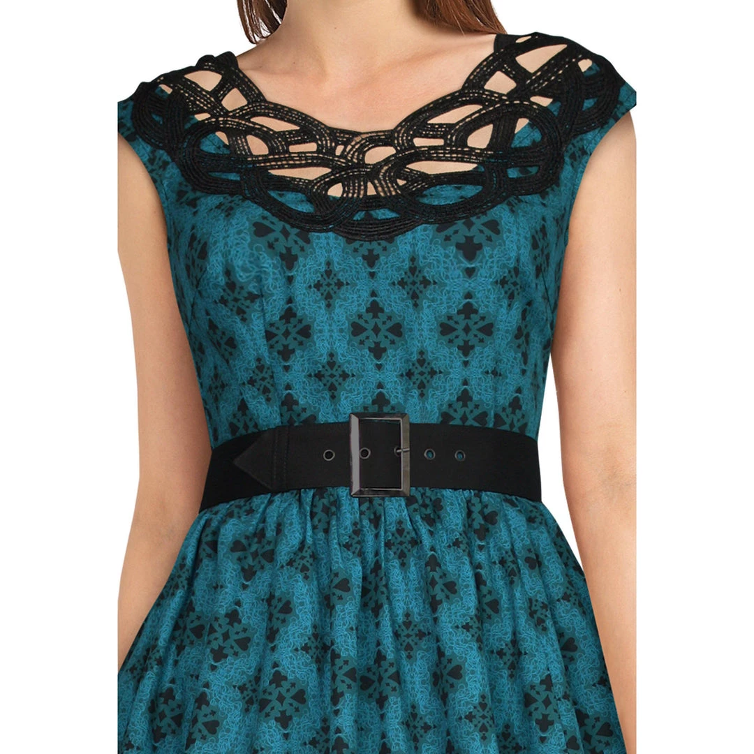 The open pattern of the labyrinth of lace at the neckline of this dress shows just the right amount of skin to be sexy and subtle, and the print is so intriguing with its intricate patterns on a turquoise background. The bodice is cap-sleeved and nipped in at the waist. The skirt is very full and there’s a wide black belt that buckles around the waist. Hidden side zipper.