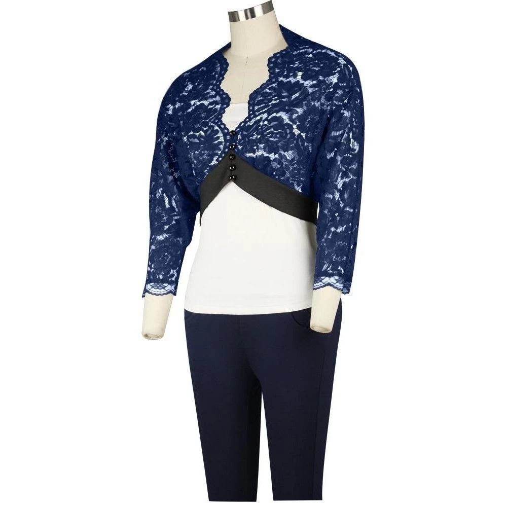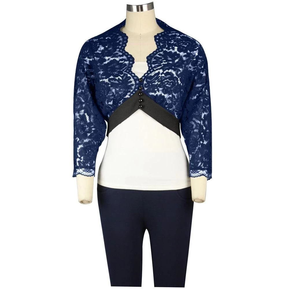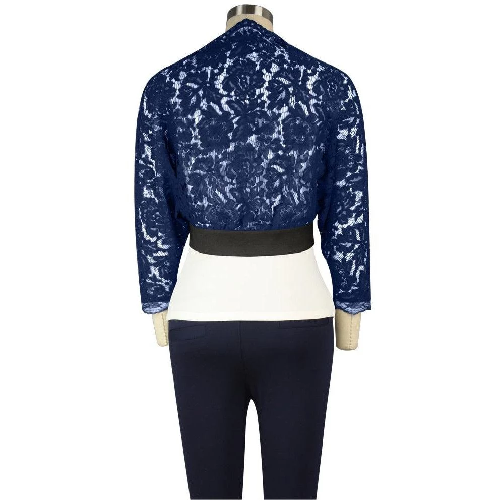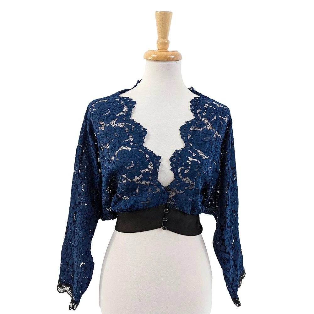 This elegant cropped lace shrug is the perfect topper for a favorite frock to add a little coverage or add a lot of pizzazz! The soft lace is scalloped around the neckline, and it closes at the waist with a wide matte satin trim. Functioning buttons and loop buttonholes down the front give the option of wearing open or closed.