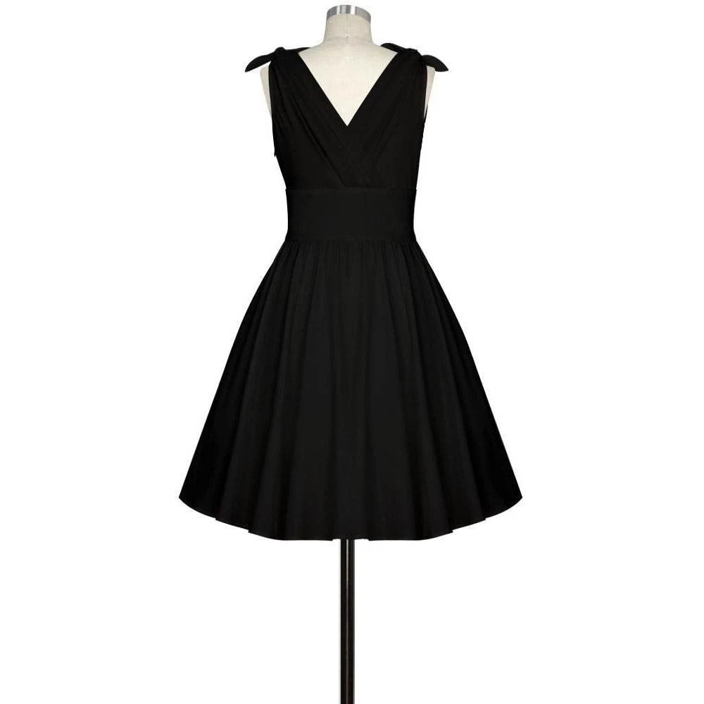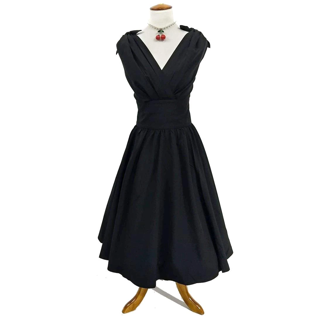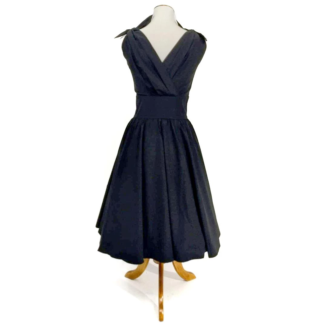 Lovely folds create a romantic Marilyn-esque look in this vintage dress. The voluptuous bustline is created by crisscrossing folds that plunge into a V-neckline. The back repeats the crisscross folds and all is finished with sweet shoulder ties. A full swing skirt is gathered into a wide waistband. Hidden side zipper.