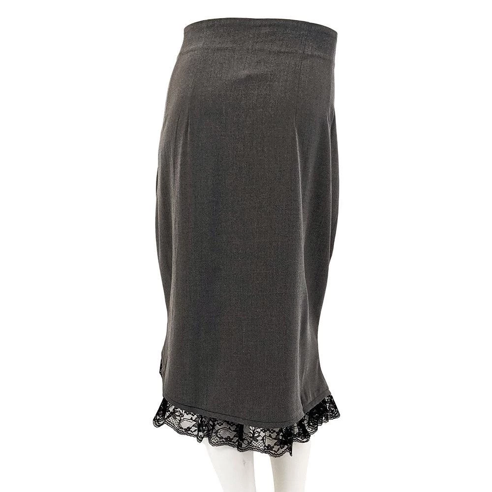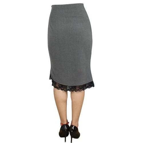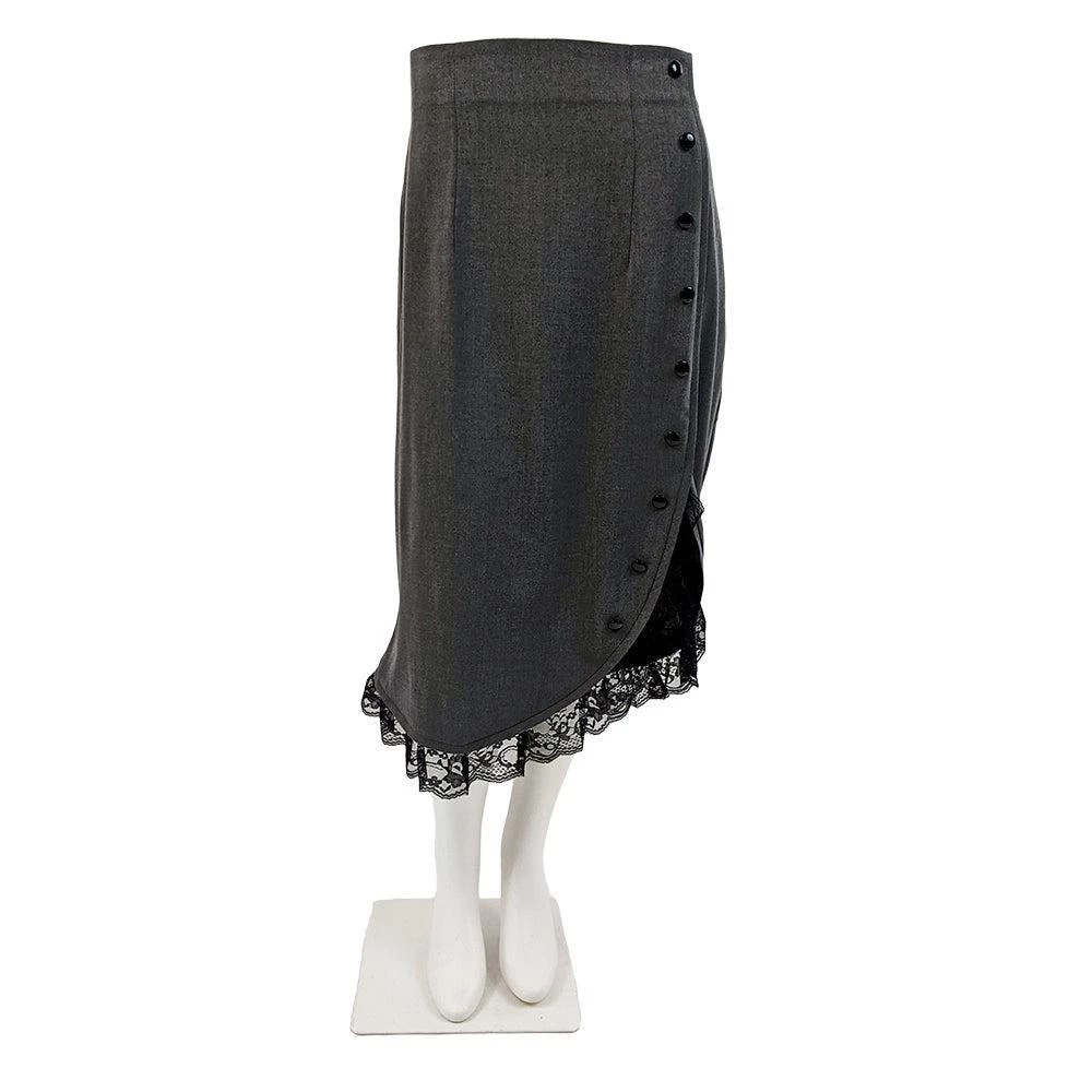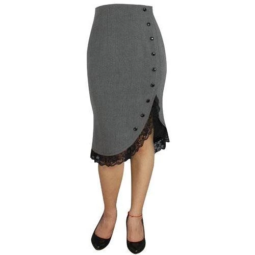 What could be more alluring than black lace against your legs? This winter gray wiggle skirt is 50s pinup perfection. The high waist has vertical shaping darts and black buttons draw attention to the hipline curve. The hem is finished in black lace and it curves up on the left side for a sexy peek above the knees. Zips up the side