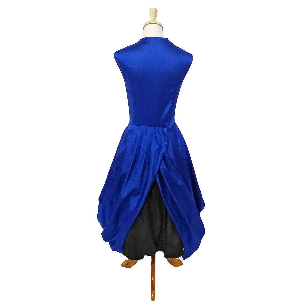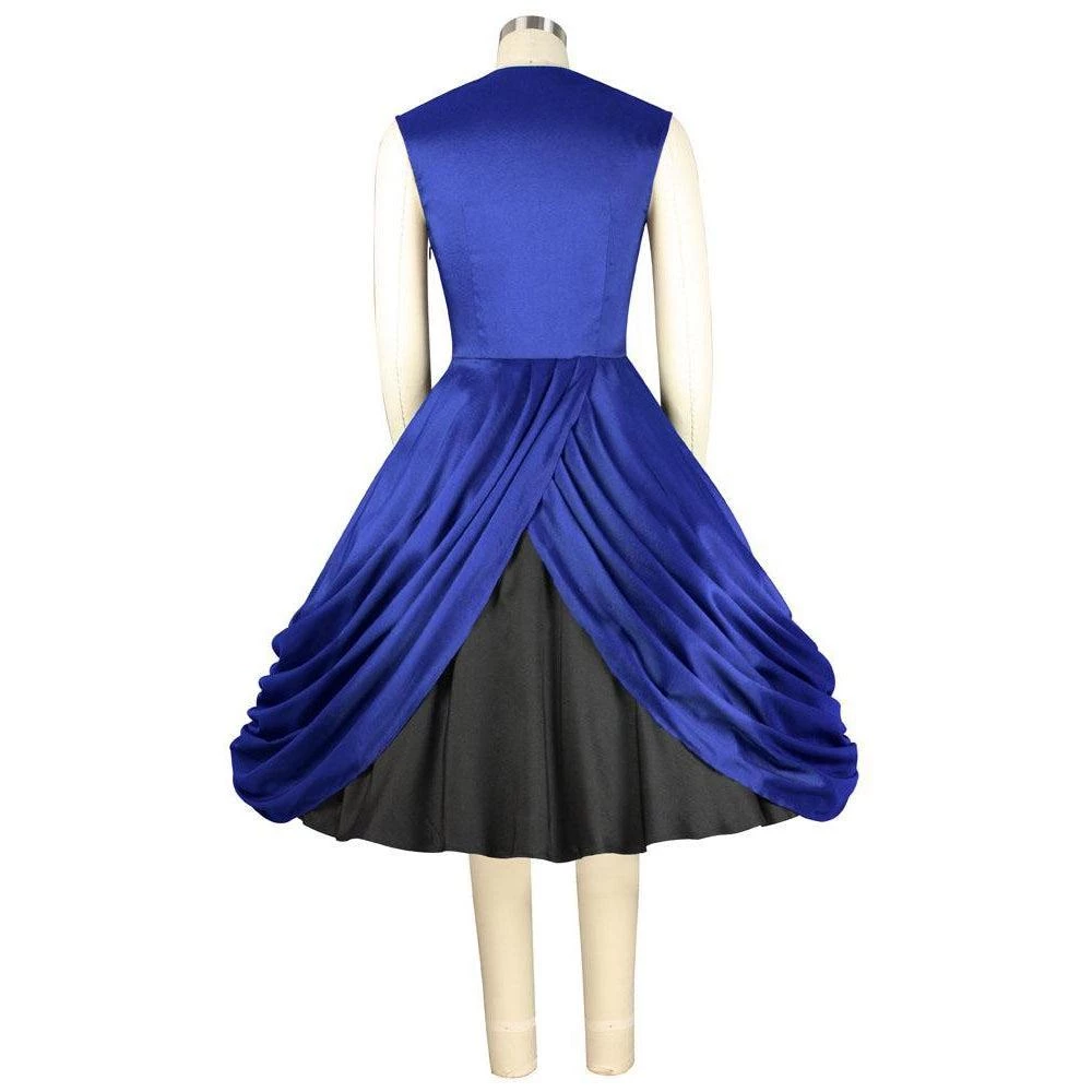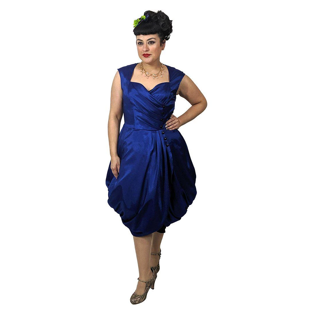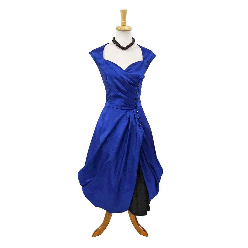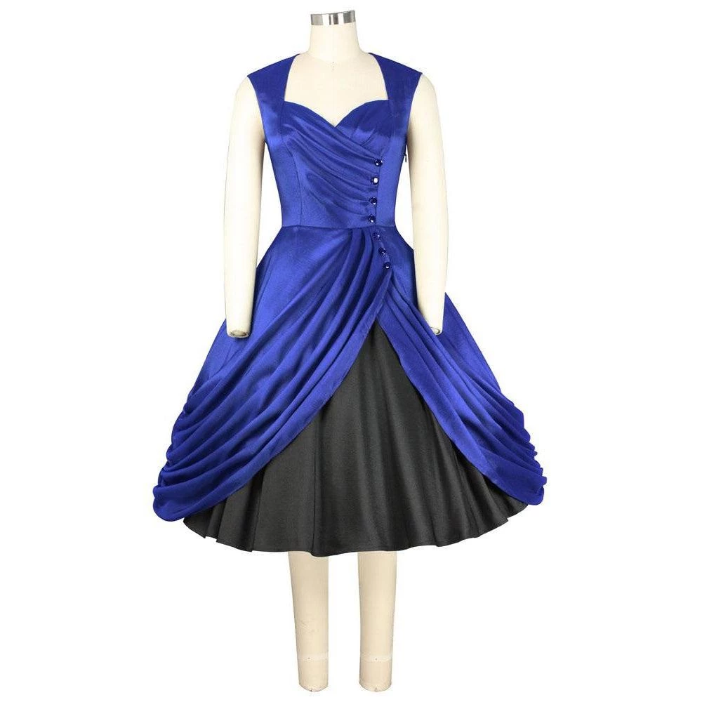 An elegantly draped swing dress featuring a gathered and crisscrossed jewel neckline, shiny black buttons on the side, and a side zipper. The fabulously layered skirt drapes the cobalt blue top layer over a black underlayer that peeks asymmetrically in front and shows centered in the back. Highly recommended to add a petticoat for the fully theatrical effect of this marvelous skirt!!