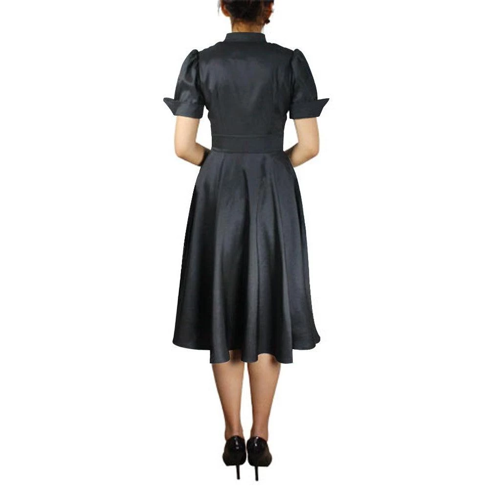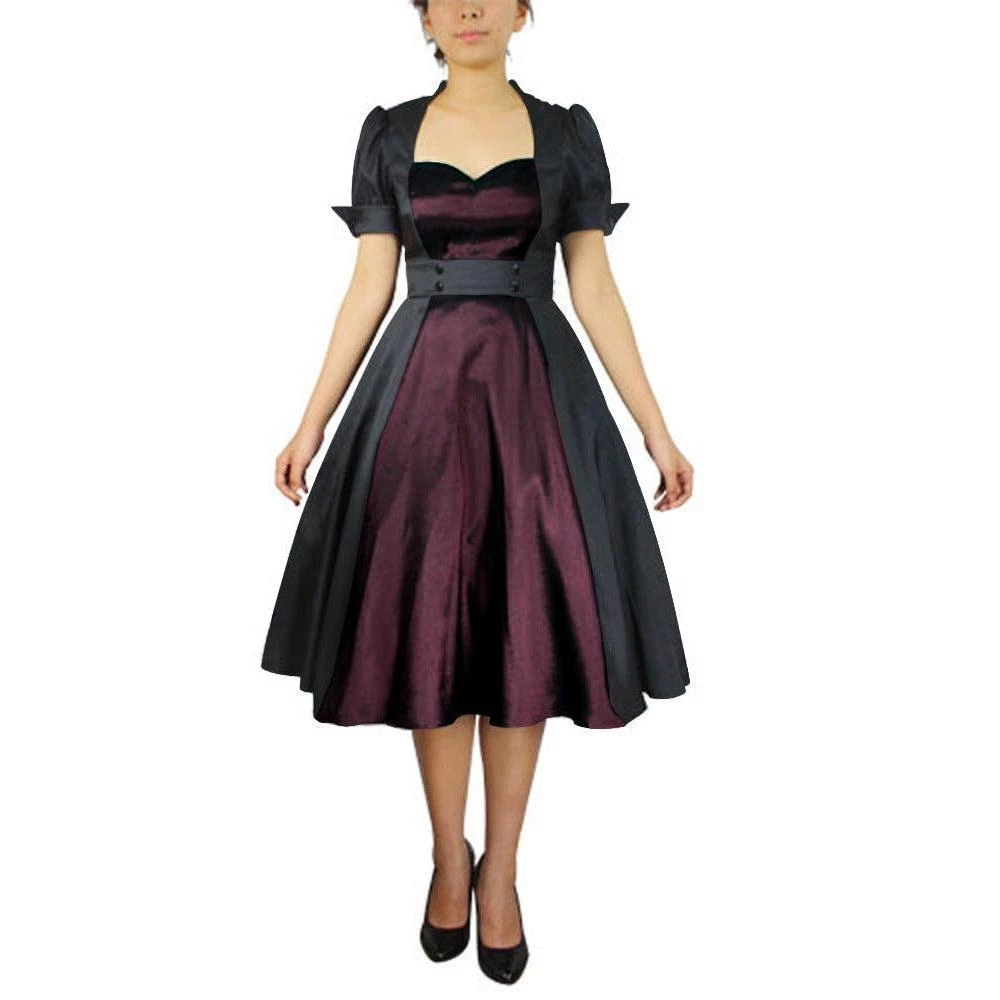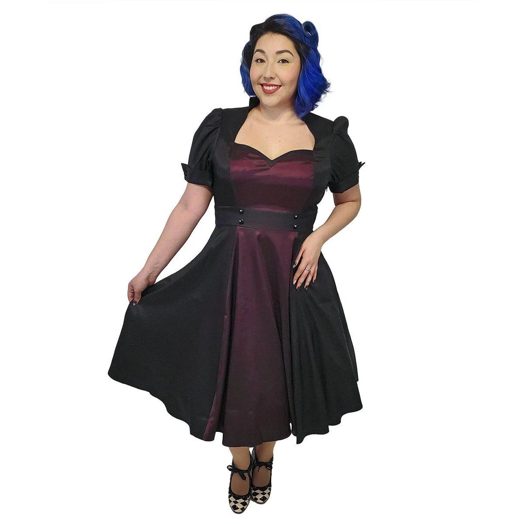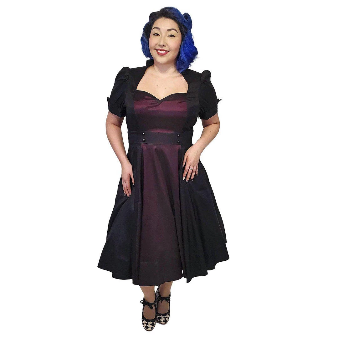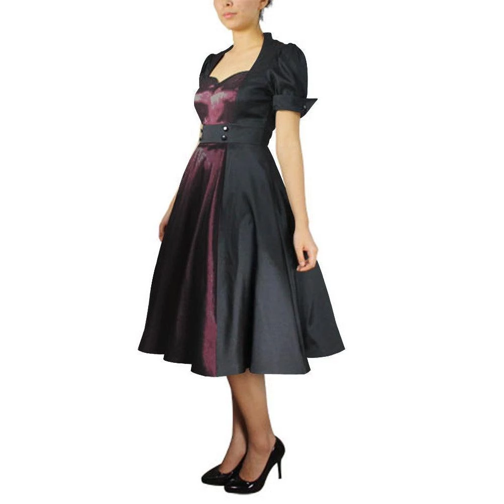 Swing into a high-glam look in this black and purple satin dress. It has a beautiful sweetheart neckline with a purple bust framed in black. The sleeves are short and have lovely detailing with cuffs and buttons, a stand-up collar to accent the decolletage, and a high waistline belt with 4 buttons. The full circle skirt is black with a purple inlay to create an ultra-slim silhouette.Â