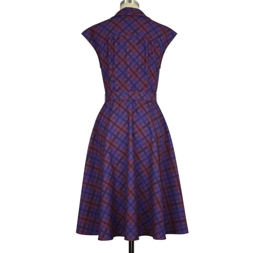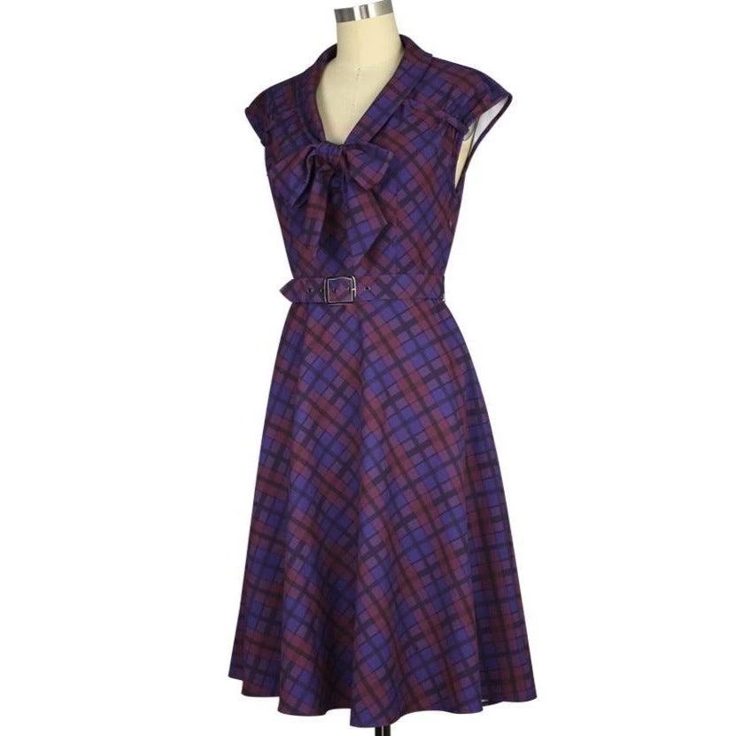 This is an absolutely stunning purple plaid swing dress! This dress features a bow on the bust, a matching belt, and a full circle skirt. This dress is most definitely a head-turner.Â