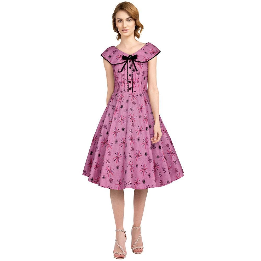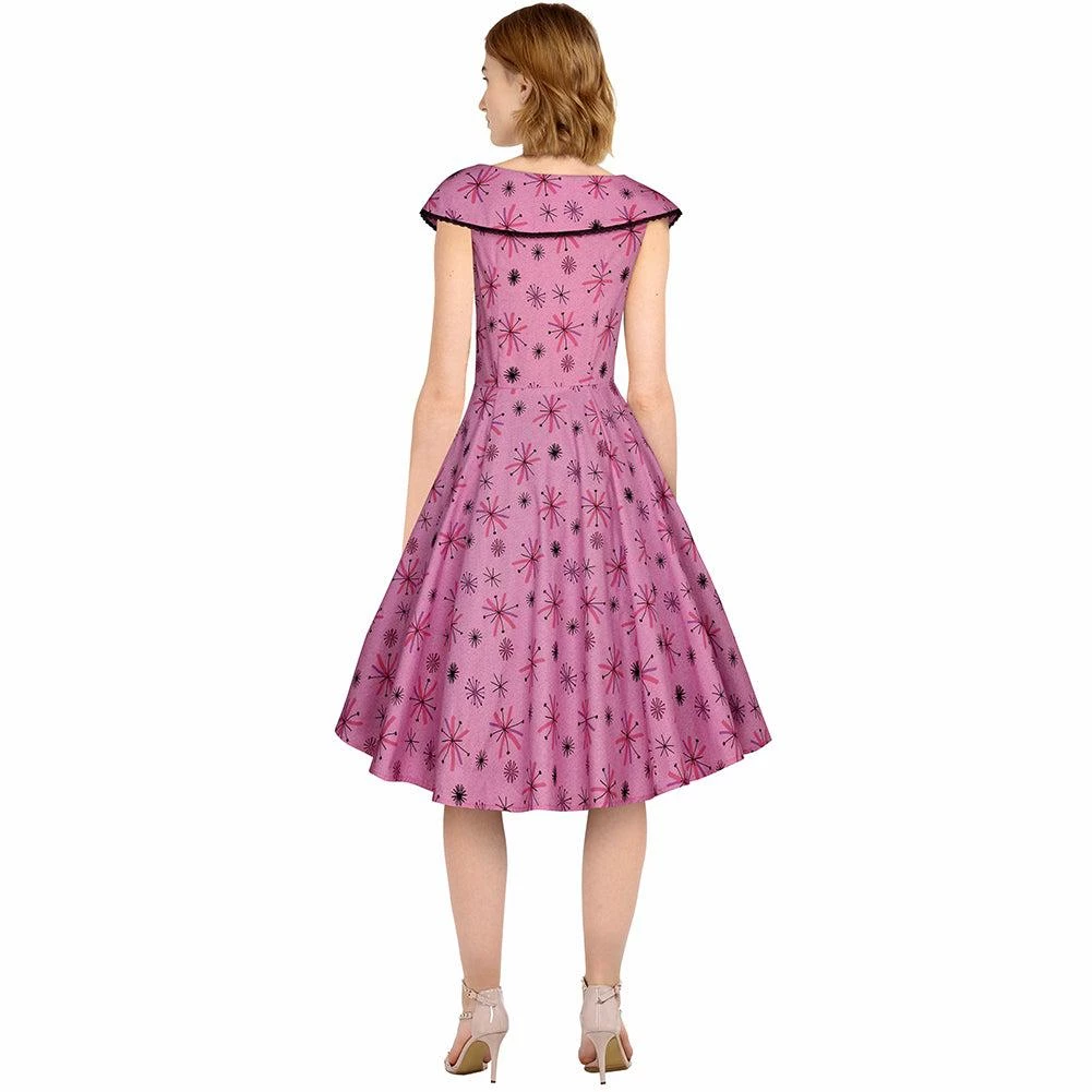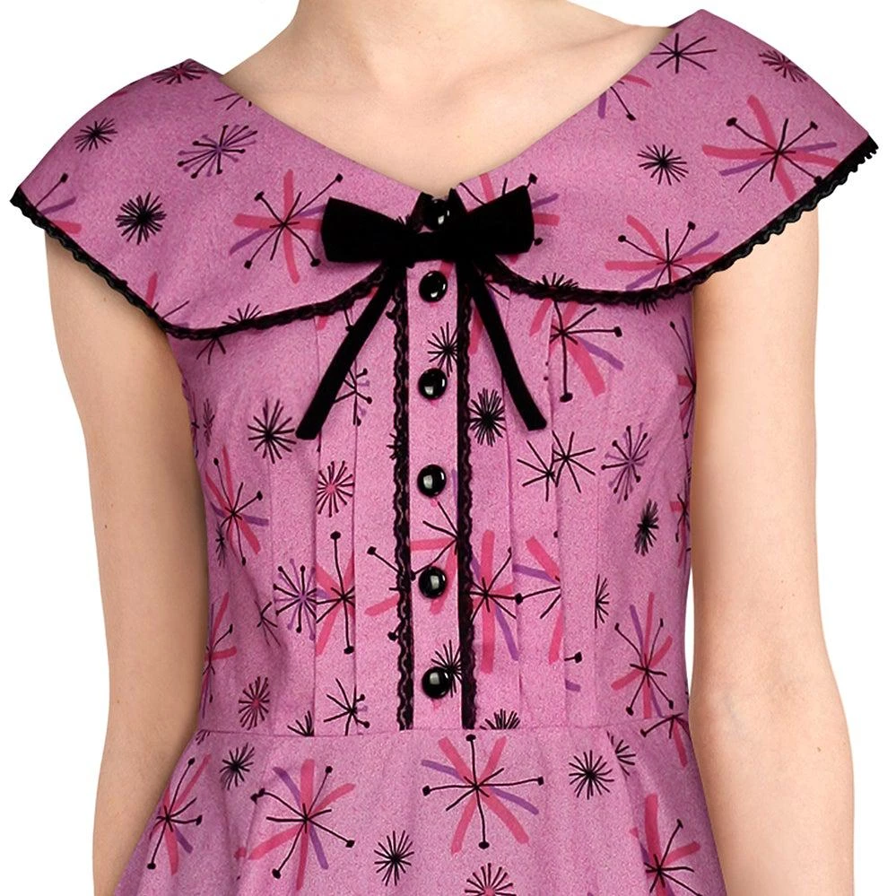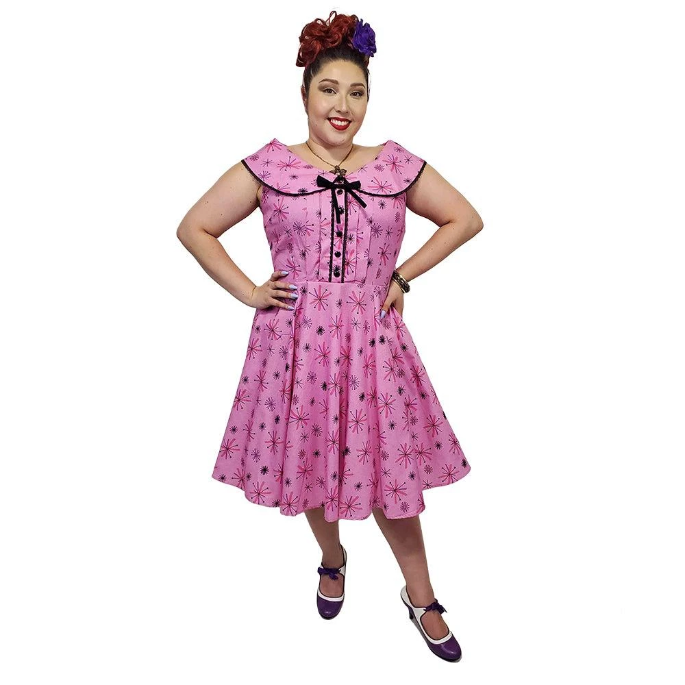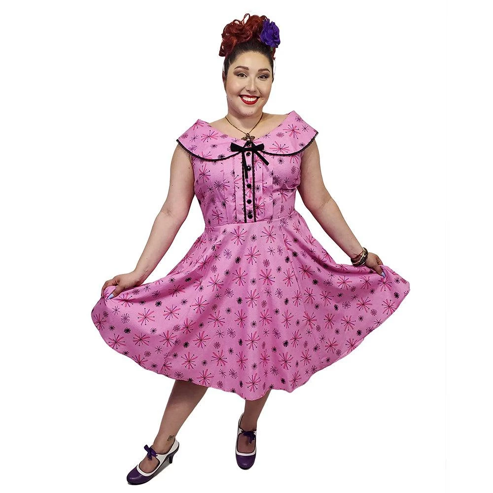 This swingin’ retro atomic-print dress in pink & black features a dramatic fold-down Peter Pan collar topped by a bold clack bow to draw the eye. The bodice is shaped with vertical pintucks alongside the functional button placket. Both the collar and the button placket are trimmed with a soft black lace for contrast. Side pockets; side zip.