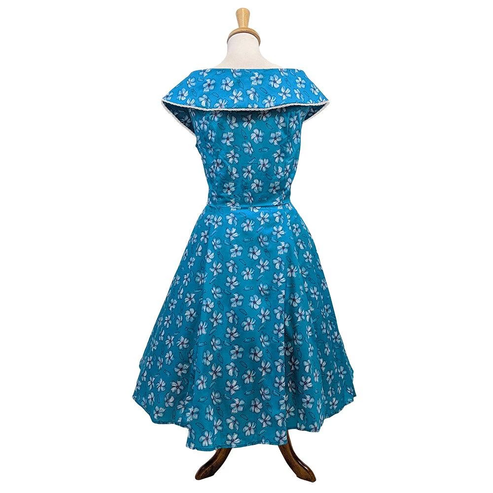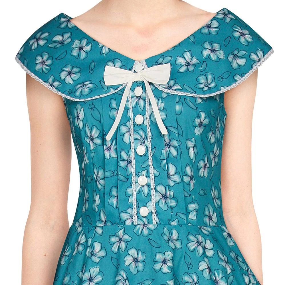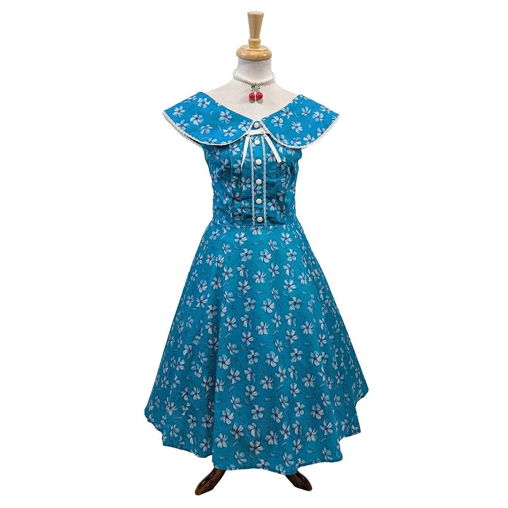 This lovely cotton swing dress in a turquoise floral print features a dramatic fold-down Peter Pan collar topped by a sweet white bow to draw the eye. The bodice is shaped with vertical pintucks alongside the functional button placket. Both the collar and the button placket are trimmed with a soft white lace for contrast. Side pockets; side zip.
