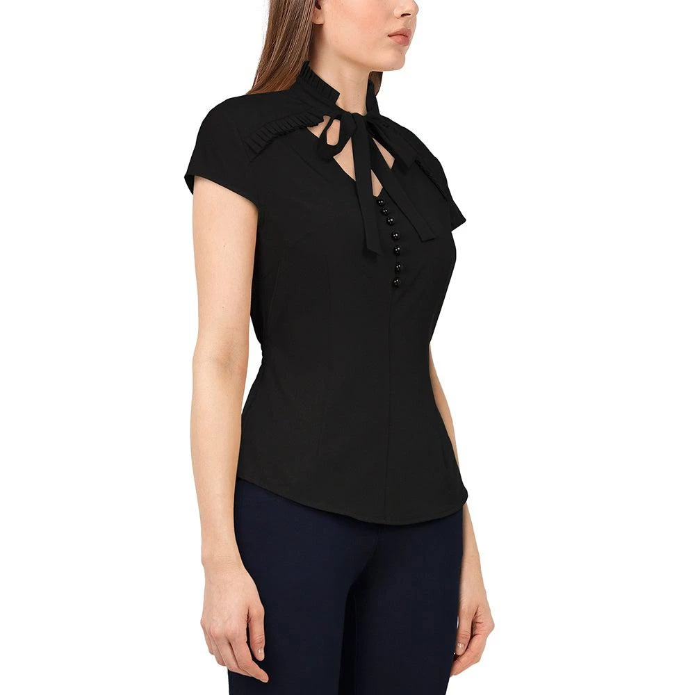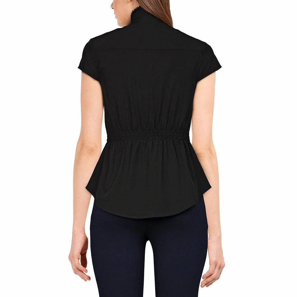 This versatile blouse is a study in contrasts, pairing a regal vamp collar with the softly-smocked waist gathers and a sweet button v-neck. There’s a layer of pleated trim at the shoulders and collar, and the collar ties with a soft belt.