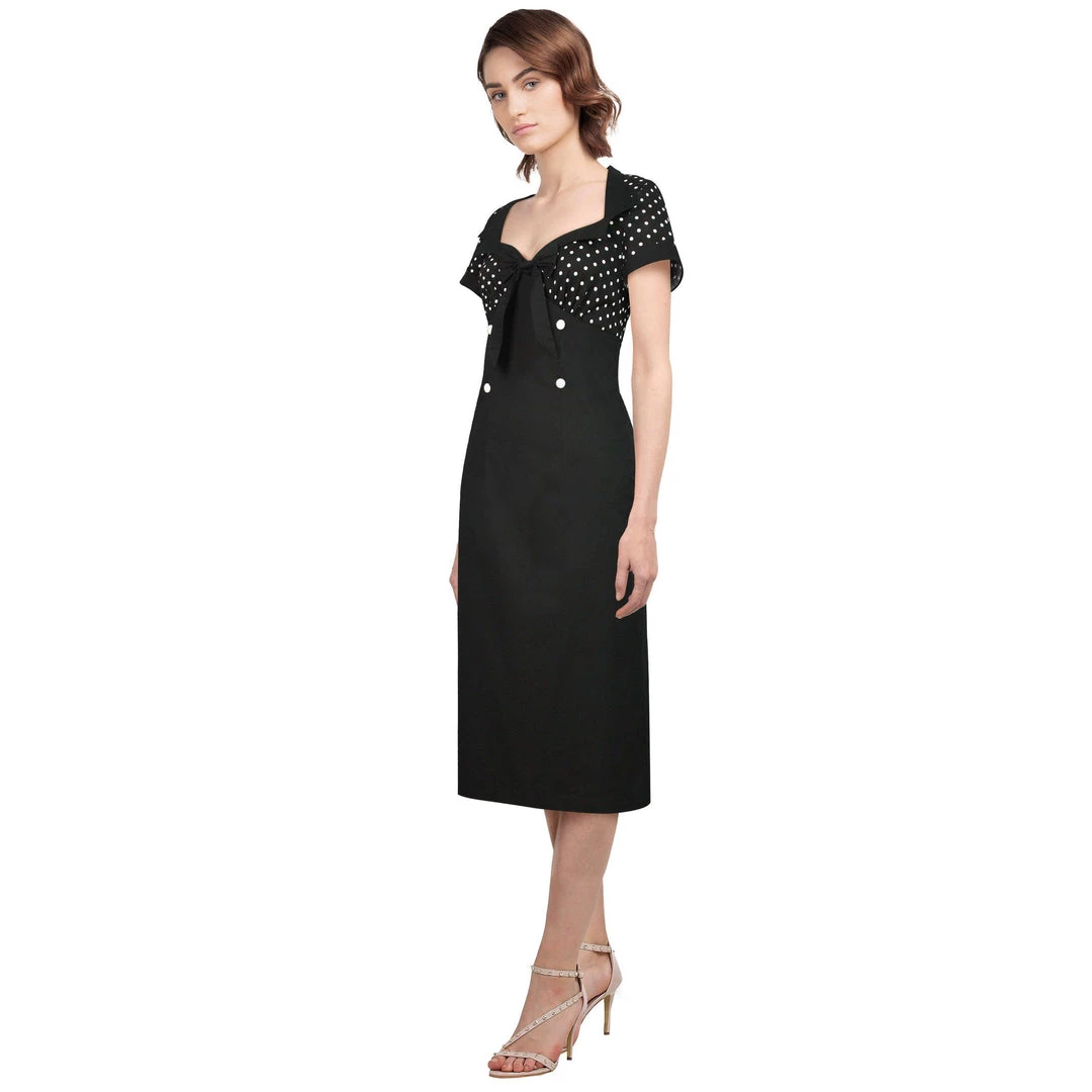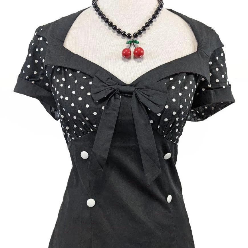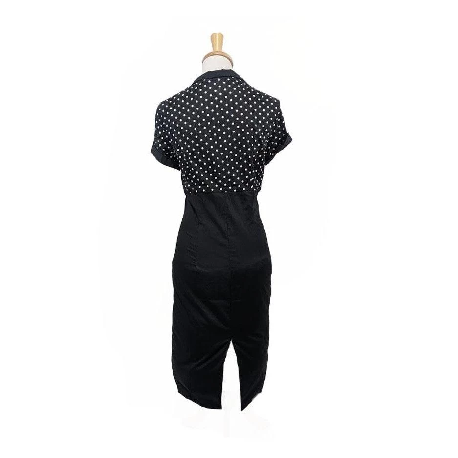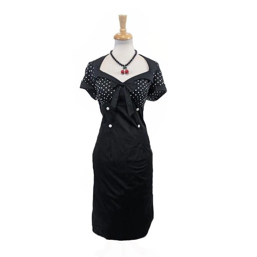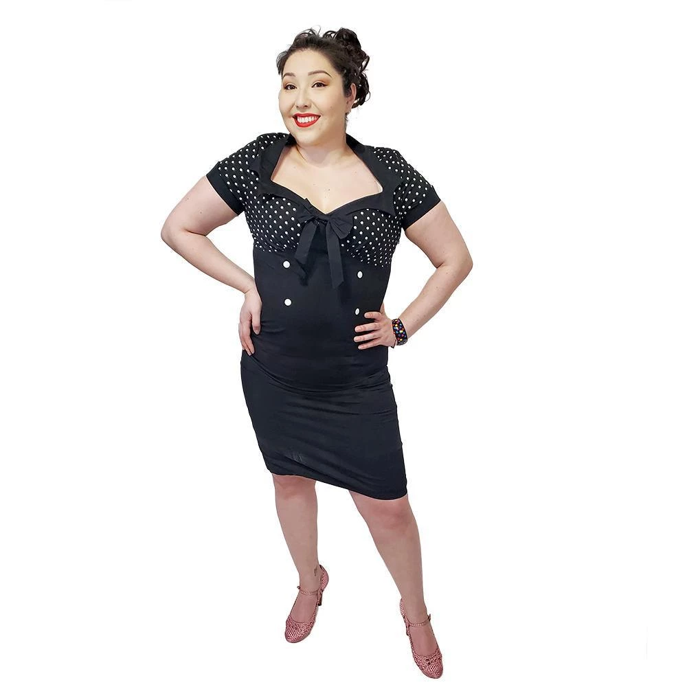 These polka-dots are perfect! With an open bust, black collar, and black bow, this dress is fantastic. The dress also includes four white buttons and a wiggle skirt to fit your figure. There is a hidden zipper up the back.