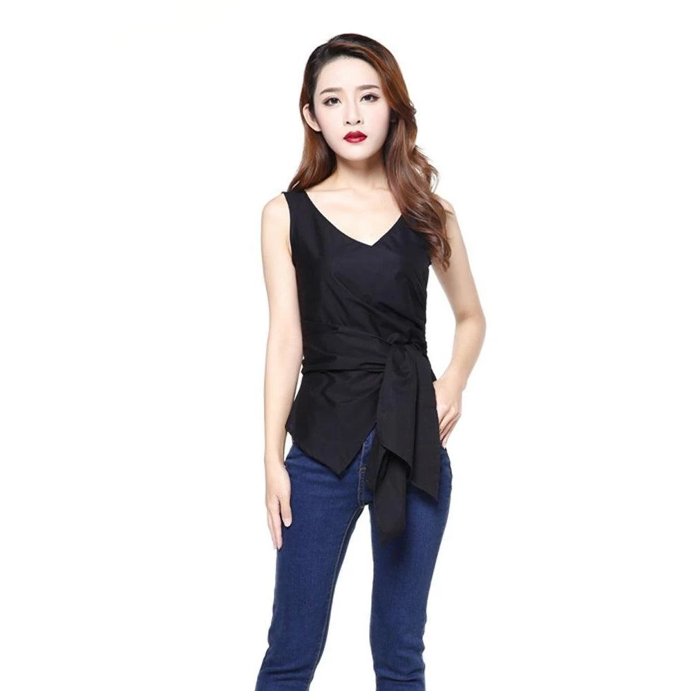 This sweet top wraps you up in feminine folds. The sleeveless top has a V-neckline and a diagonal hemline, both formed with crossing front layers. The wrap is created with abundant fabric, ruched on the left side, wrapped around the body, and cleverly tied in front.