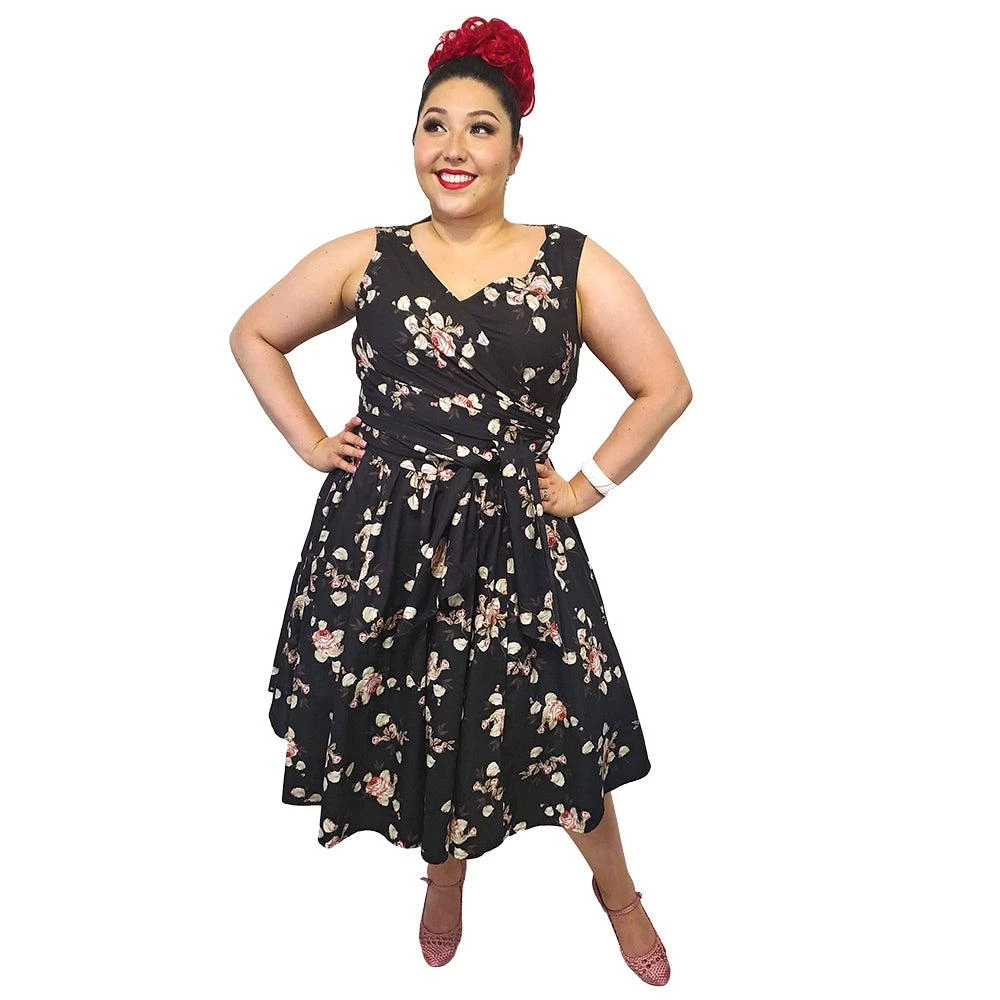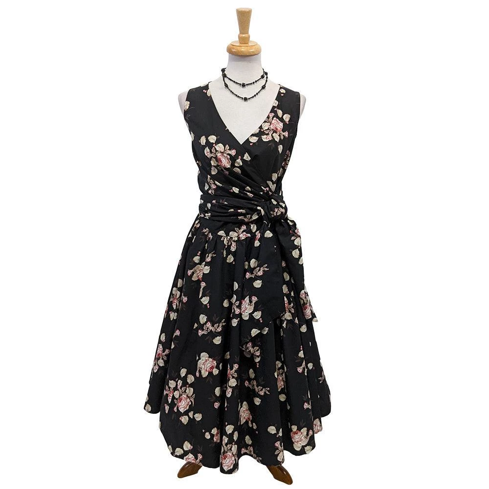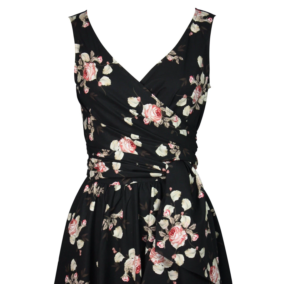 This stunning dress features light pink roses with light green leaves on a black background. It features a lightly-gathered surplice bust that ties on the side for a customizable fit and an attached sash belt. Zips up the back.