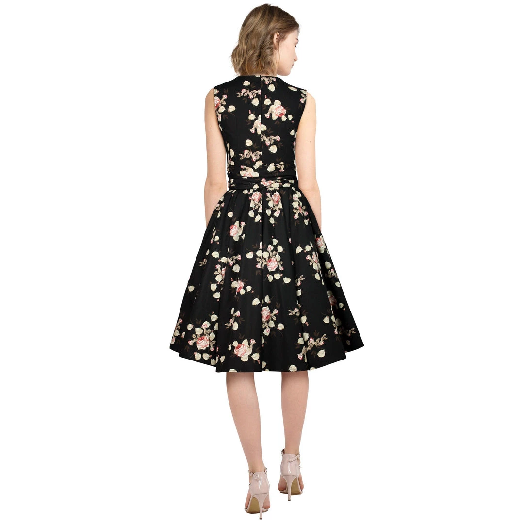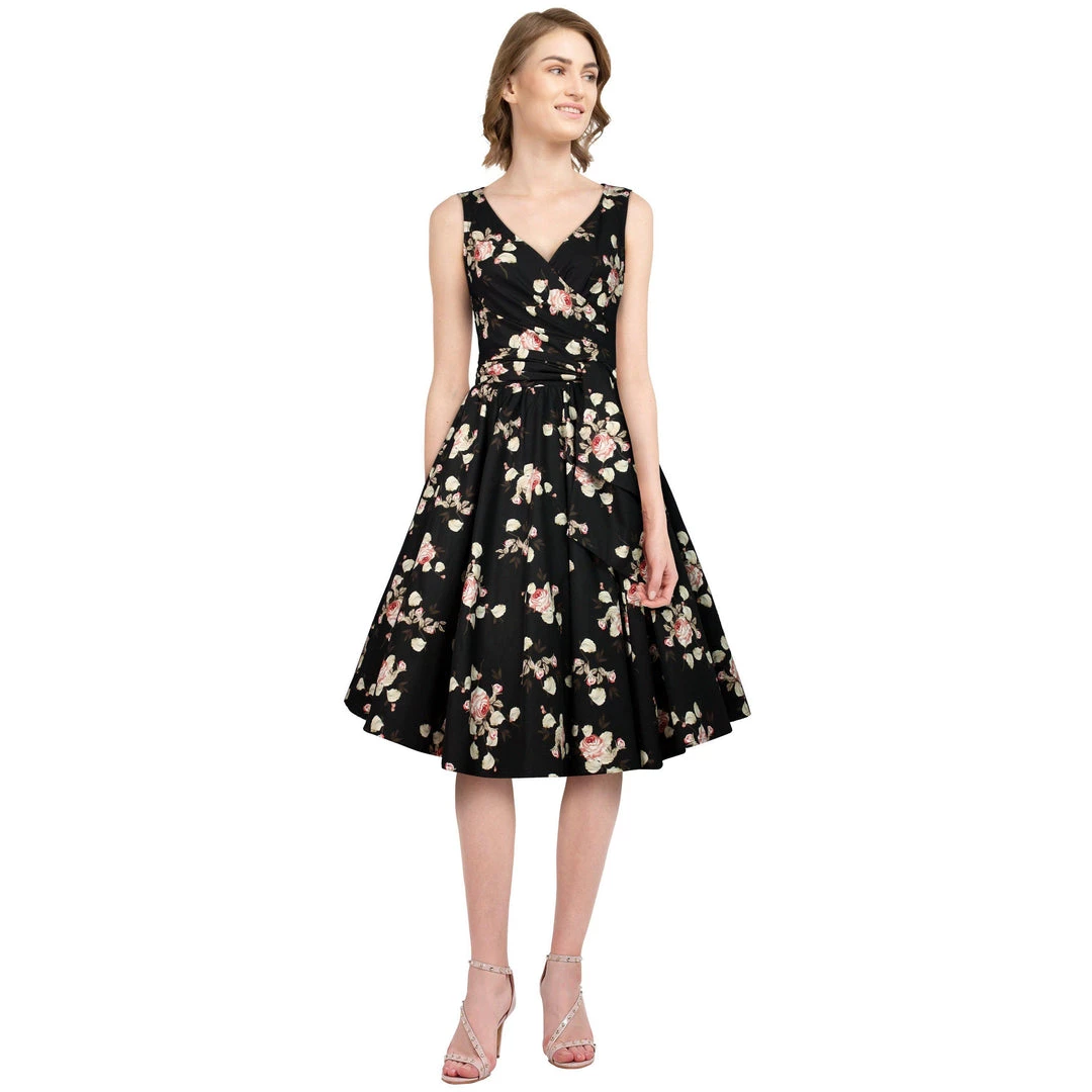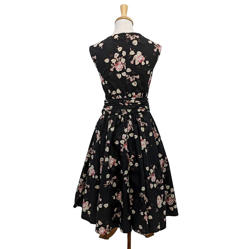 This stunning dress features light pink roses with light green leaves on a black background. It features a lightly-gathered surplice bust that ties on the side for a customizable fit and an attached sash belt. Zips up the back.