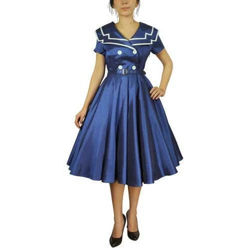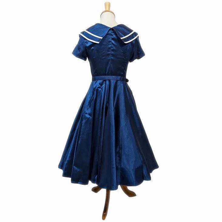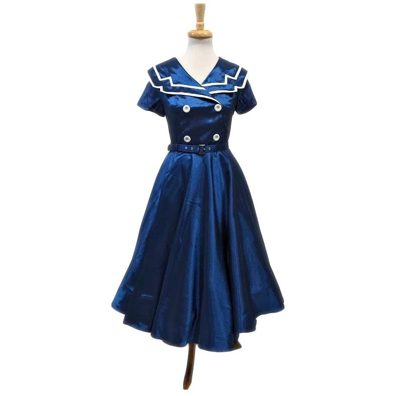 This dress is sure to float your boat! In a gorgeous navy blue, this dress features a double sailor collar with white accents. Four white buttons are included on the front for an extra pop. With short sleeves, a matching navy blue belt, and a hidden zipper up the side, this dress is so perfect!Â