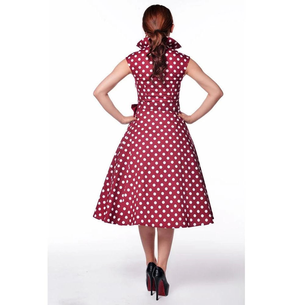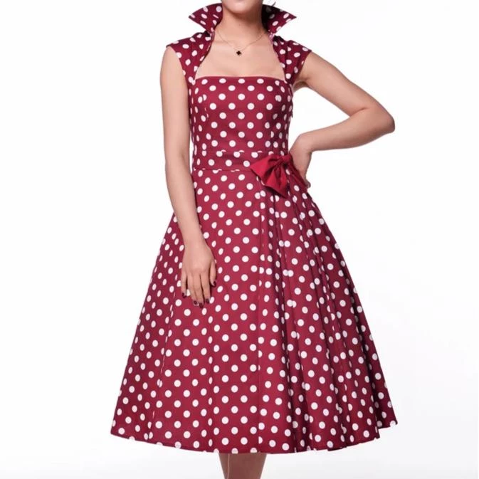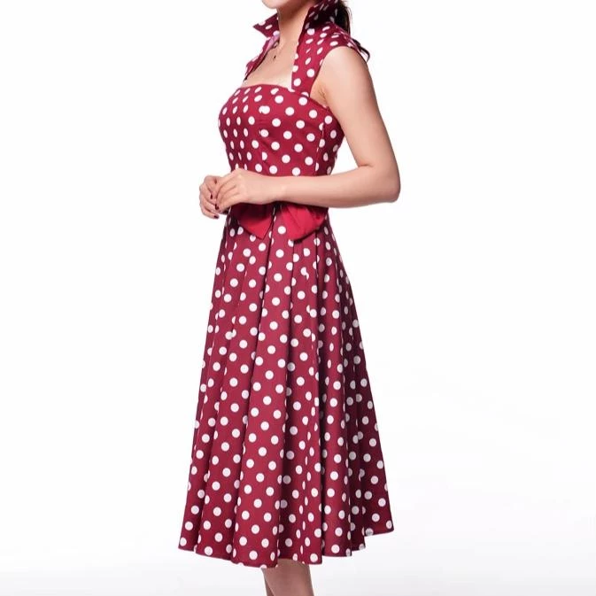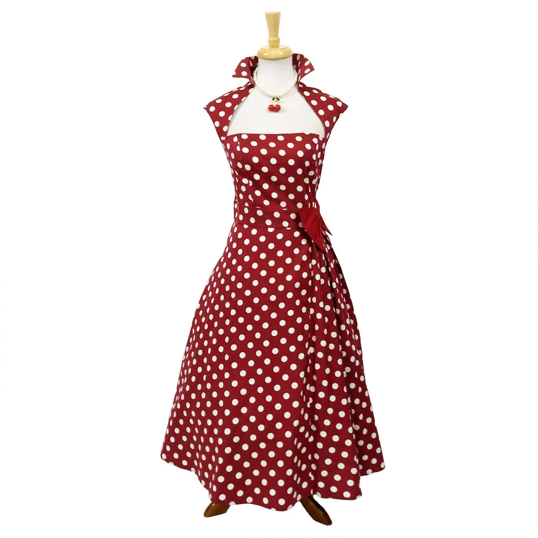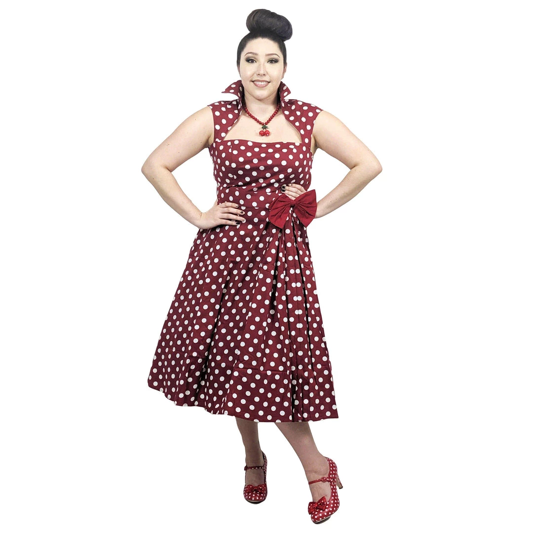 This crazy cool retro style dress of red with white polka dots is the perfect vamp outfit for parties and events! The dress has a beautiful square neckline with a stand up pointed collar and cap sleeves. The skirt is very full with pleating on the left side accented with a red bow at the waist.