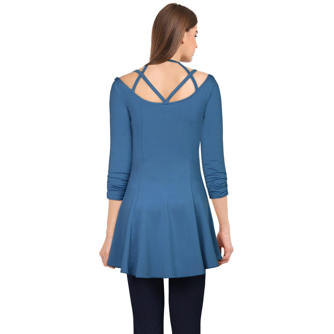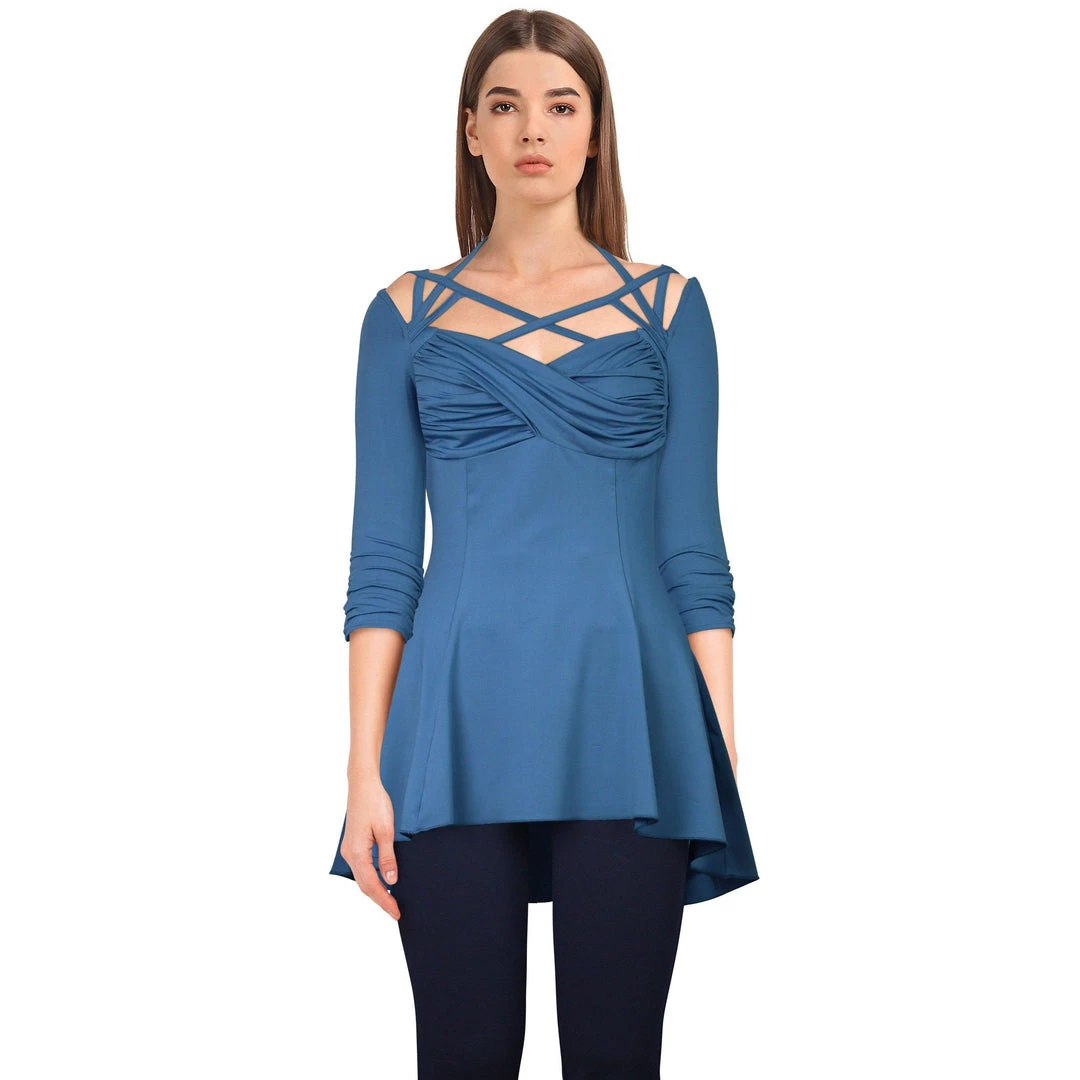 Be everyone’s sweetheart in this versatile strappy jersey top. The super-flattering ruched & wrapped sweetheart neckline is topped off by an assortment of angled straps that continue on to the scooped rear neckline. The flared hem sits nicely atop your favorite cigarette pants or tucked under a voluminous swing skirt.Â