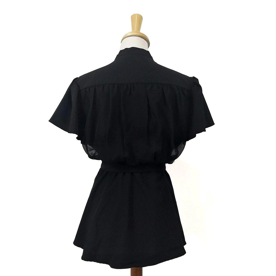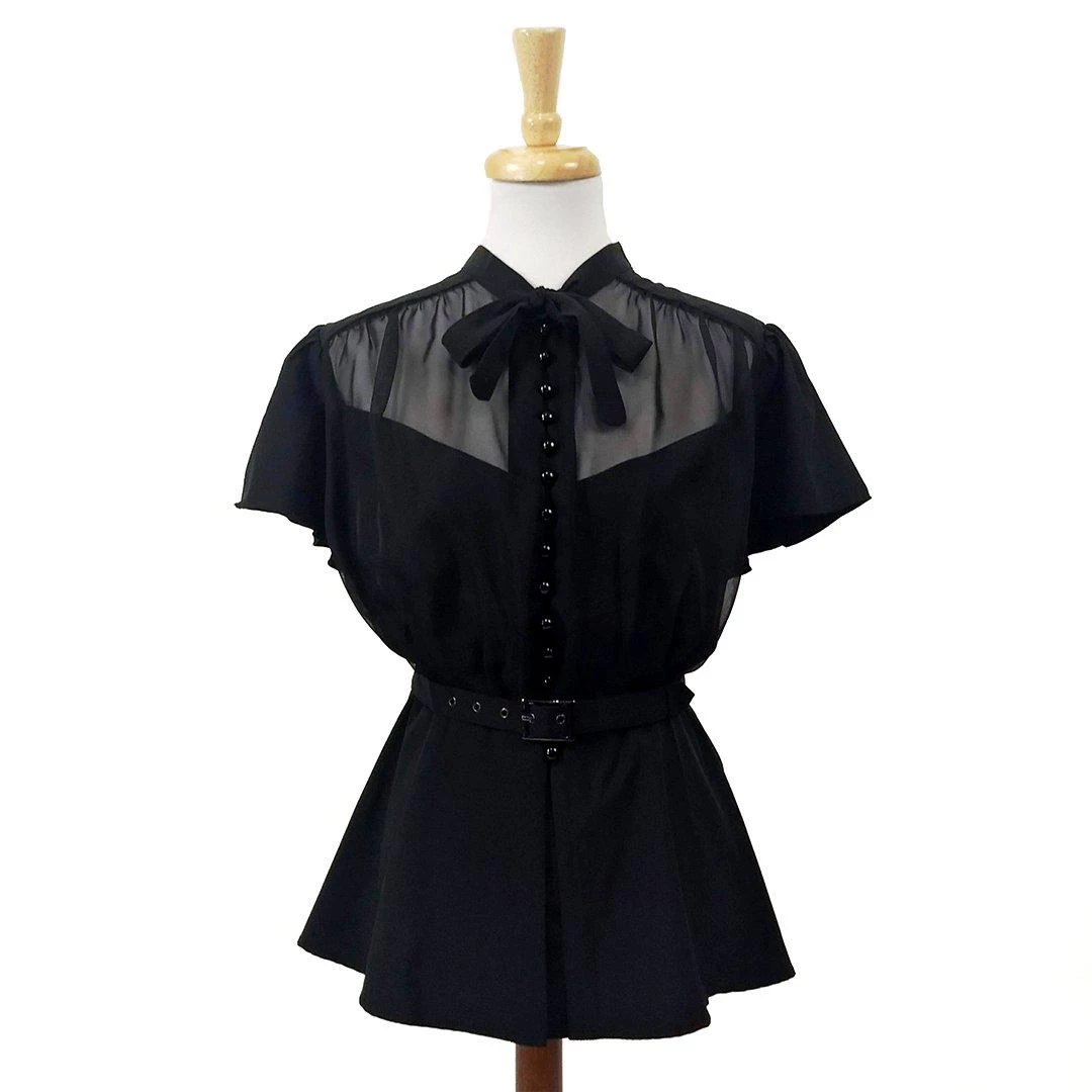 This pretty peplum-skirted blouse features a soft and see-through chiffon upper over a solid body. The solid short sleeves are delicately fluttery and feminine. It ties at the neck and has a matching waist belt.