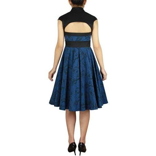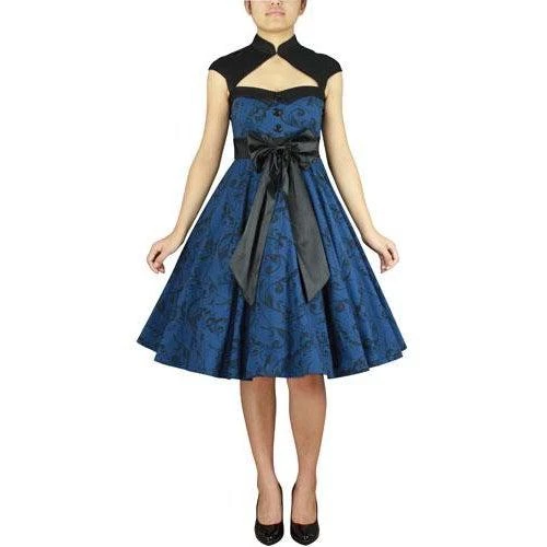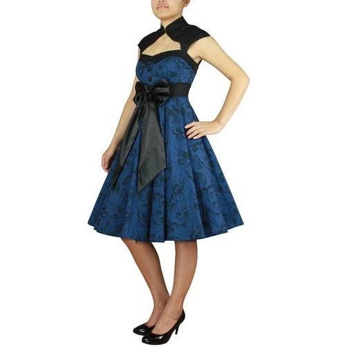This fantastic dress has a formal edge with its little black bolero-esque top and a super full swing skirt finished with a huge satin bow. A voluptuous peekaboo styling is accomplished with cutouts on the decolletage and across the upper back of the bolero, which has a mandarin collar fastened with a hook and barely-there cap sleeves. The main body of the dress is a beautiful scroll print in black on a blue background. The bodice has a fold-over collar in black, is nipped in at the waist, and features 3 big black buttons down the front. Perfect for a night at the theater!!