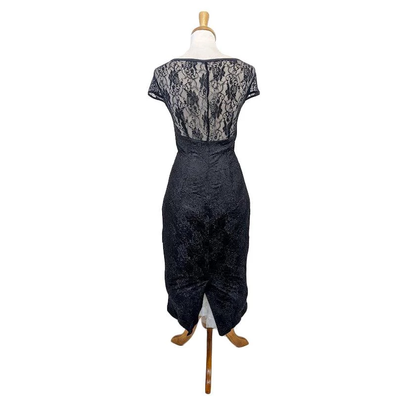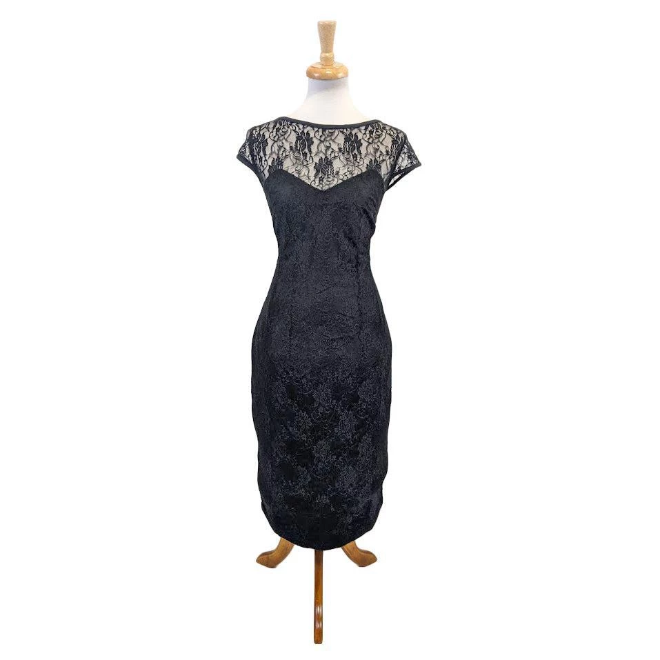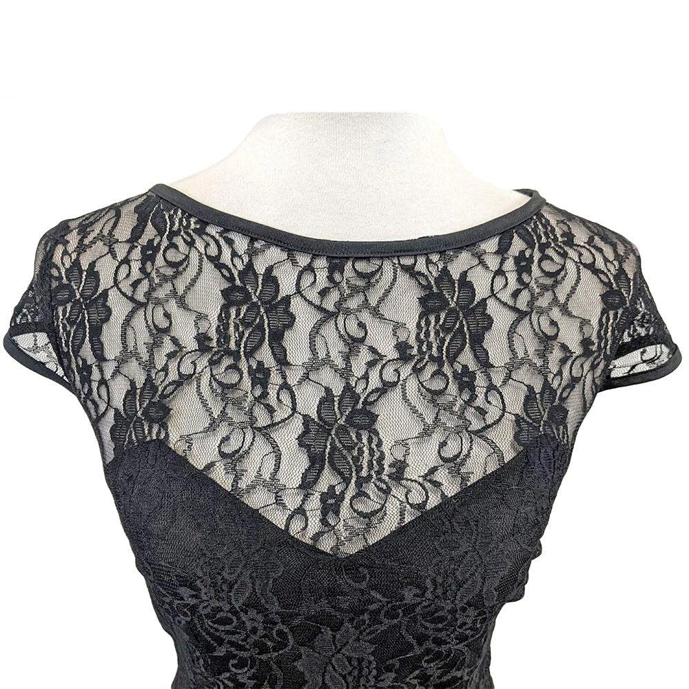 This gorgeous dress features a black sleeveless layer with a black lace overlay. The bottom layer has a sweetheart neckline while the lace overlay has a high neckline. The dress also has cap sleeves, a short slit in the back, and has a hidden zipper up the side.