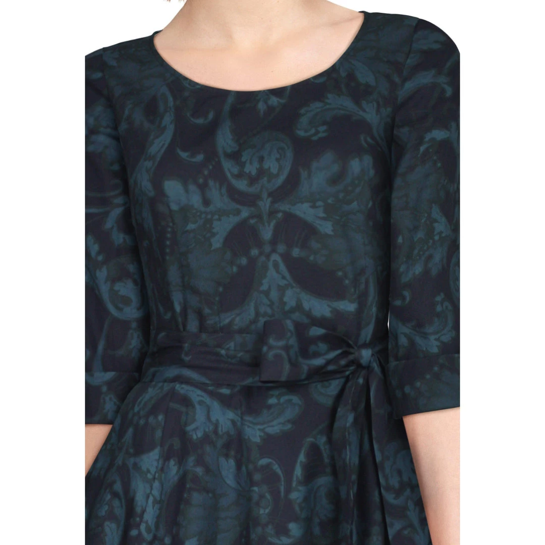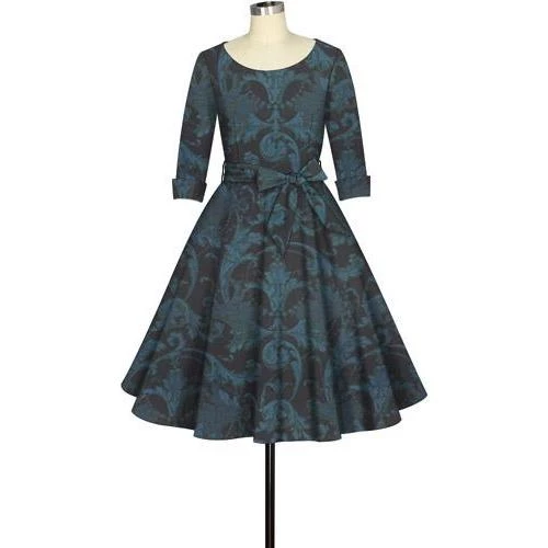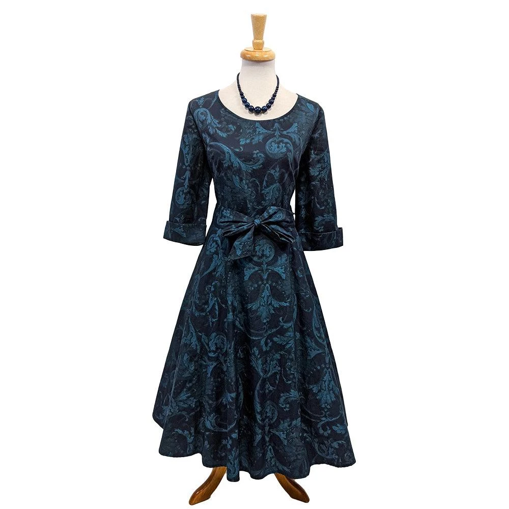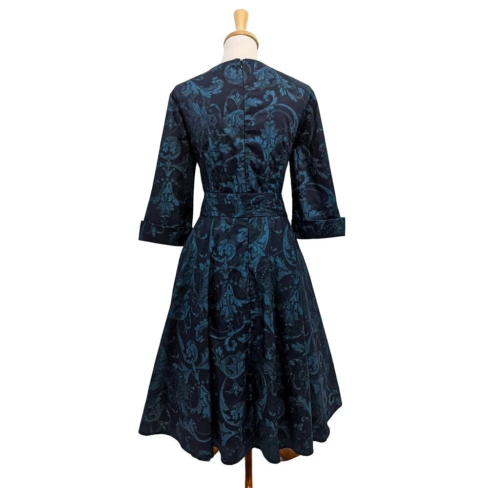 This scoop-necklined spooky beauty is just the thing for your next midnight ball. It features a flatteringly fitted bodice over a gracefully full skirt, all in an eyecatching black & blue floral cotton fabric. The elbow-length sleeves are finished with jaunty upturned cuffs. Rear zip.