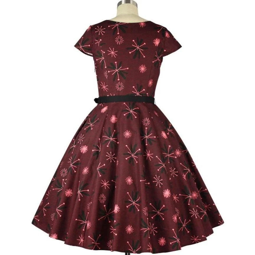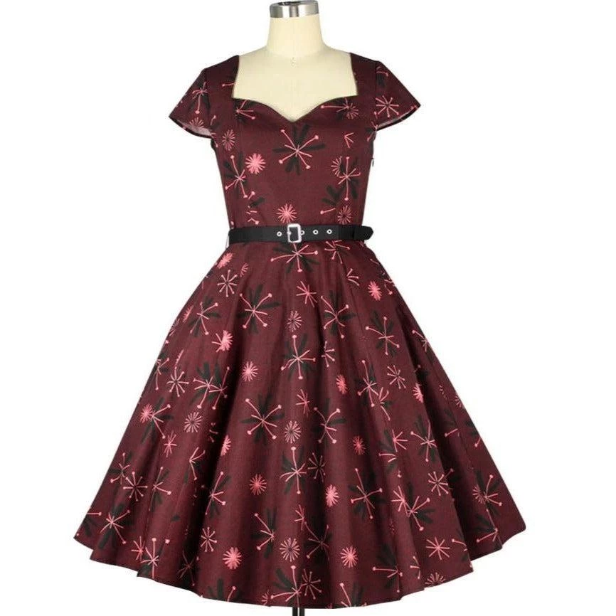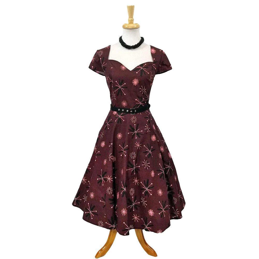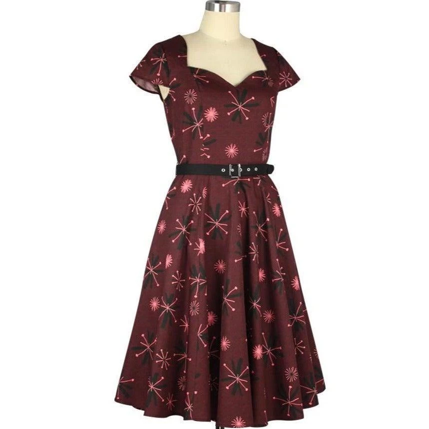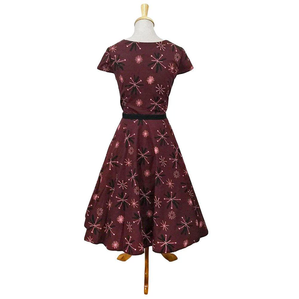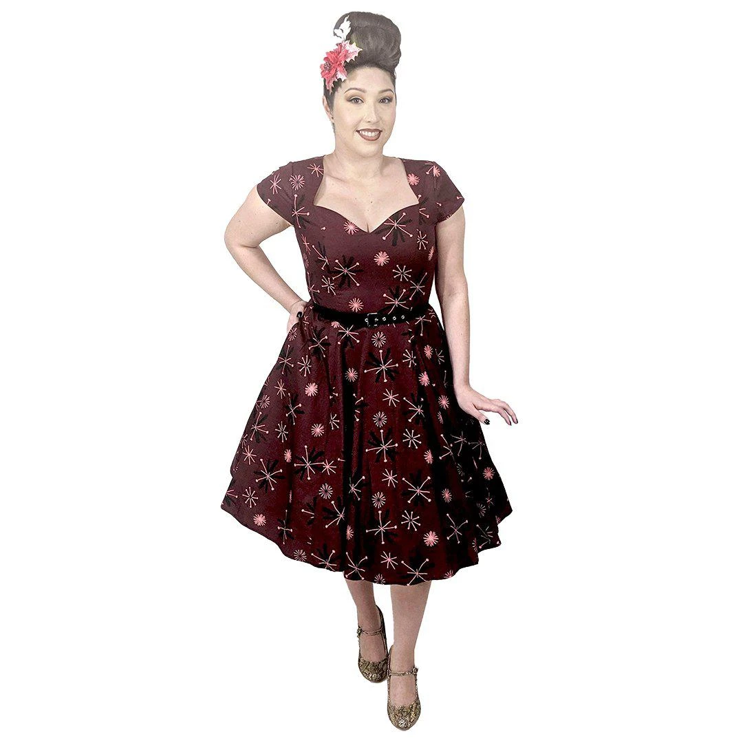 Go retro in this gorgeous deep red atomic burst print dress. It has a sweetheart neckline, short sleeves, a removable belt, deep pockets, and a full circle skirt. The works!