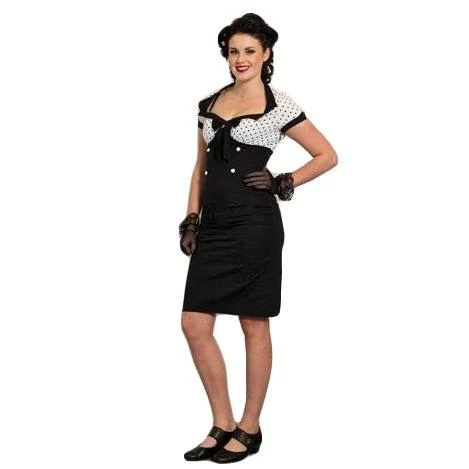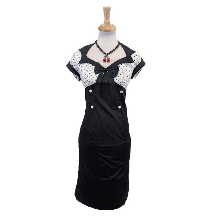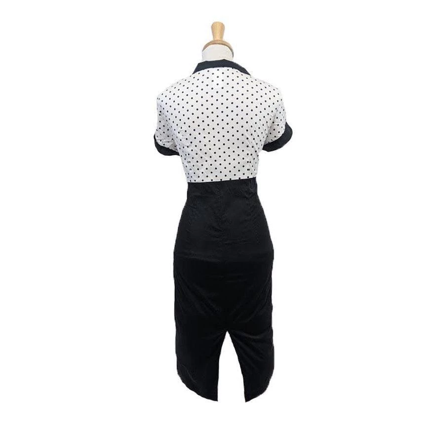 These polka-dots are perfect! With an open bust, black collar, and black bow, this dress is fantastic. The dress also includes four white buttons and a wiggle skirt to fit your figure. There is a hidden zipper up the back.