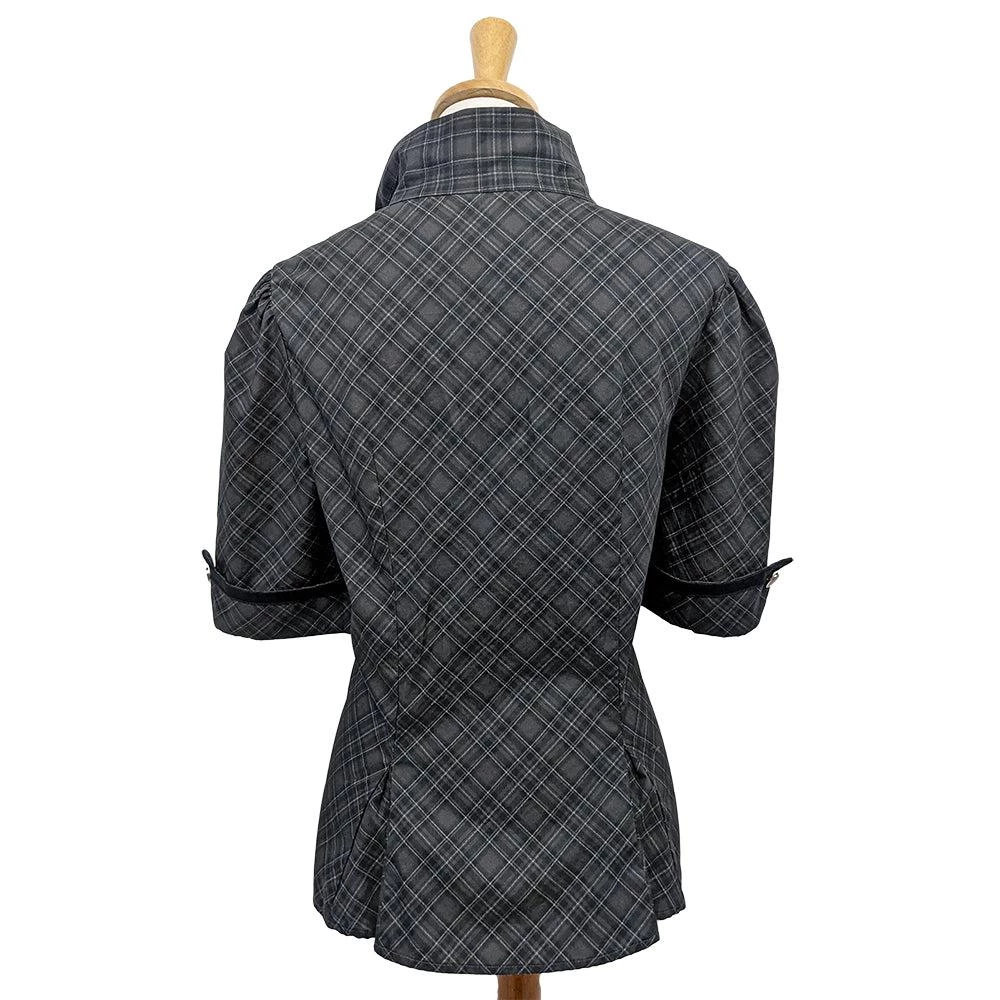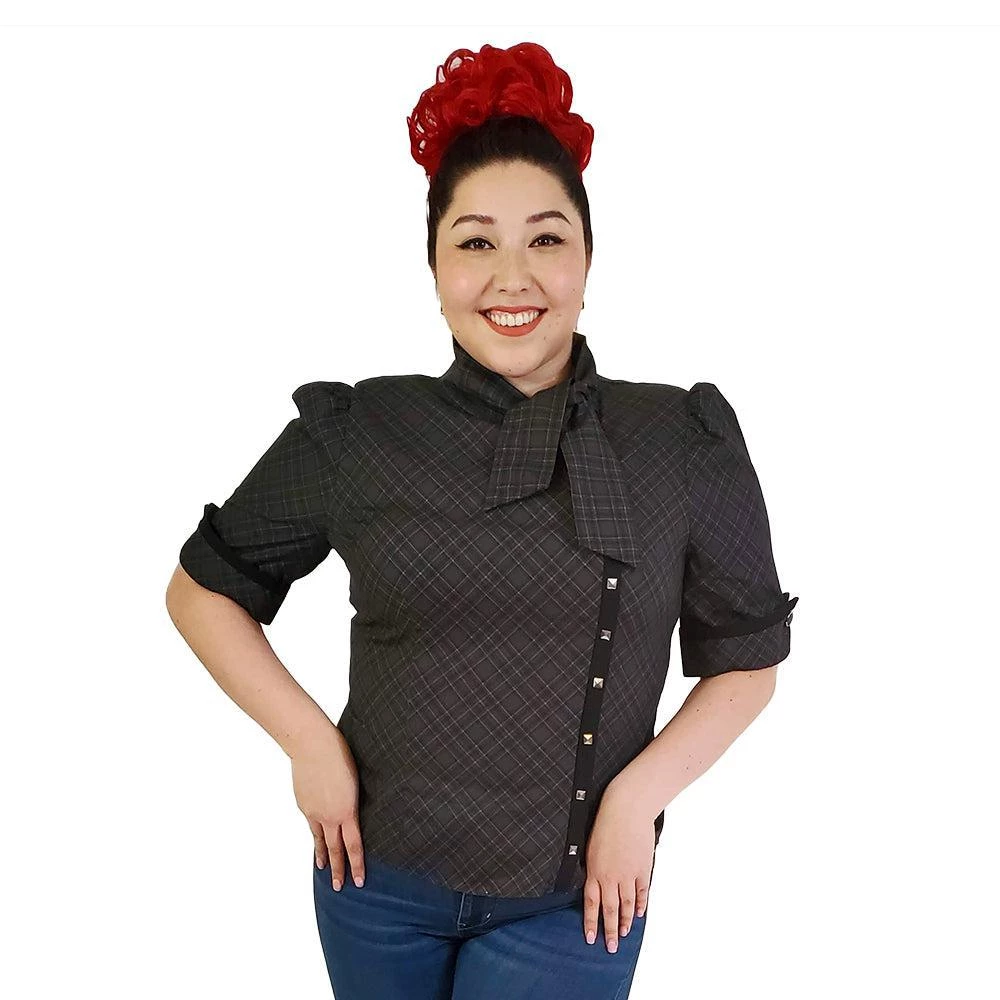 Liven up your library look in this unique retro-inspired top! The hidden front zipper closure is covered by the studded vertical black trim, all topped off with a tie neckline. Gently puffed sleeves end in an upturned cuff at about elbow length, trimmed in black and fastened with shiny black buttons. The fitted bodice flares into a vented waist for a flattering shape whether untucked or worn under your favorite swing skirt.Â