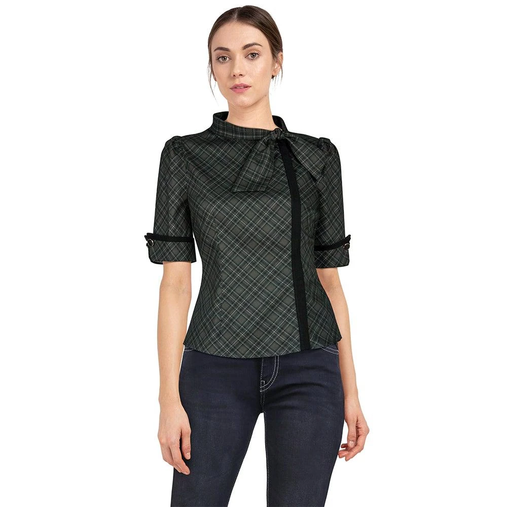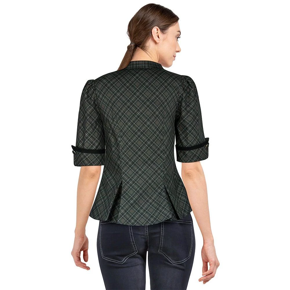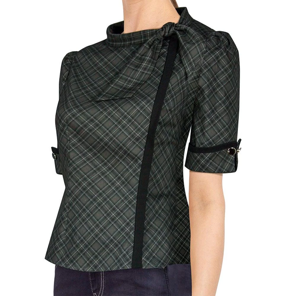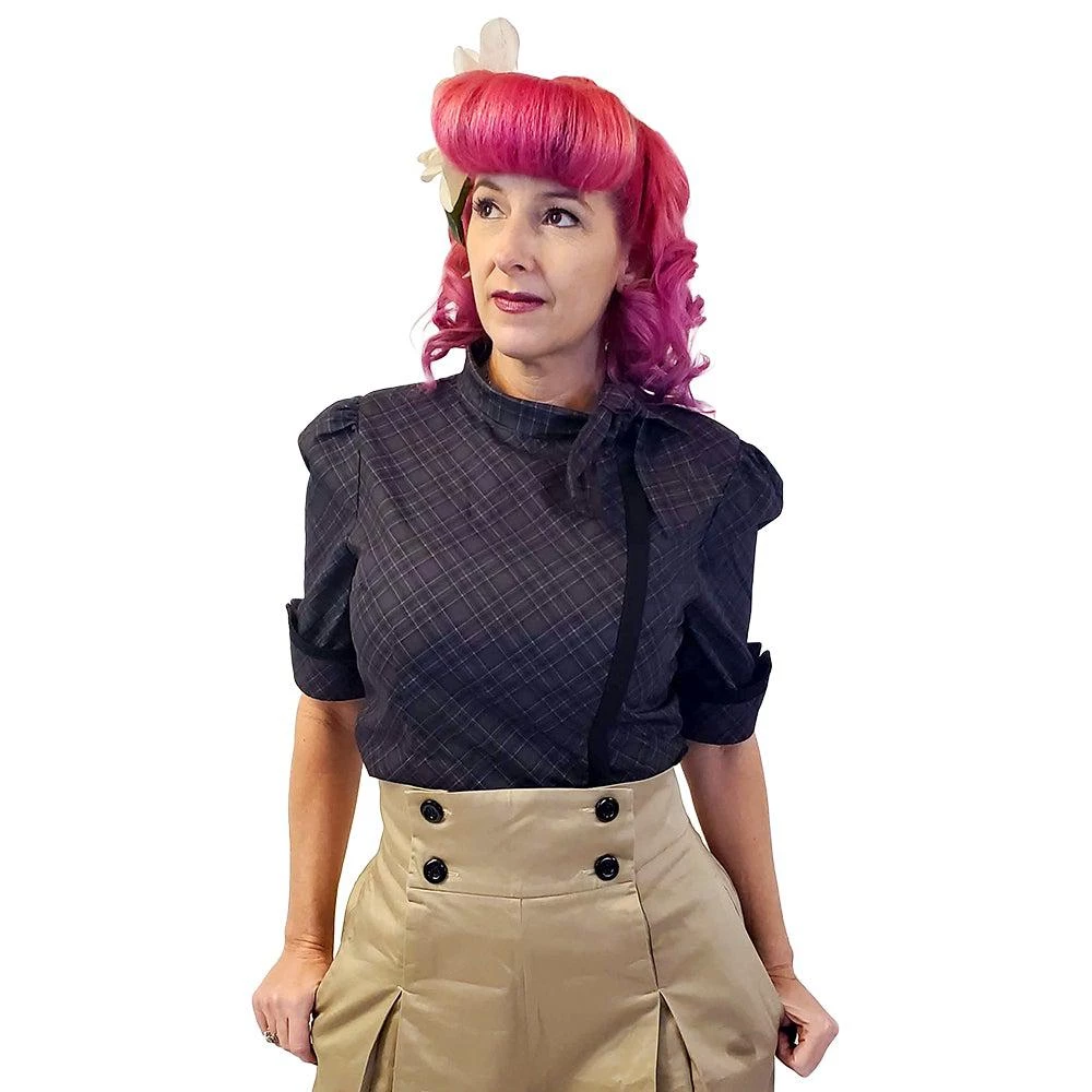Liven up your library look in this unique retro-inspired top! The hidden front zipper closure is covered by the vertical black trim, all topped off with a tie neckline. Gently puffed sleeves end in an upturned cuff at about elbow length, trimmed in black and fastened with shiny black buttons. The fitted bodice flares into a vented waist for a flattering shape whether untucked or worn under your favorite swing skirt.Â