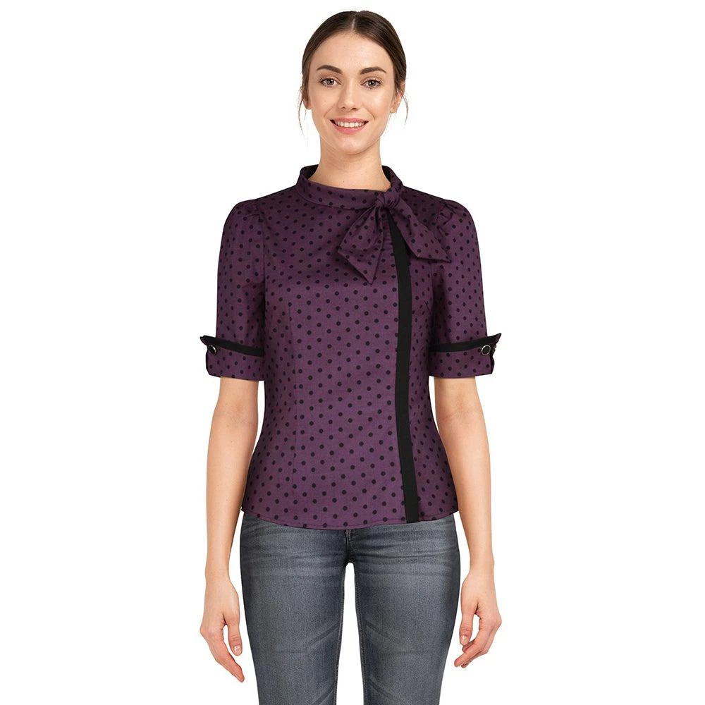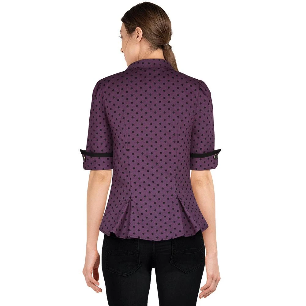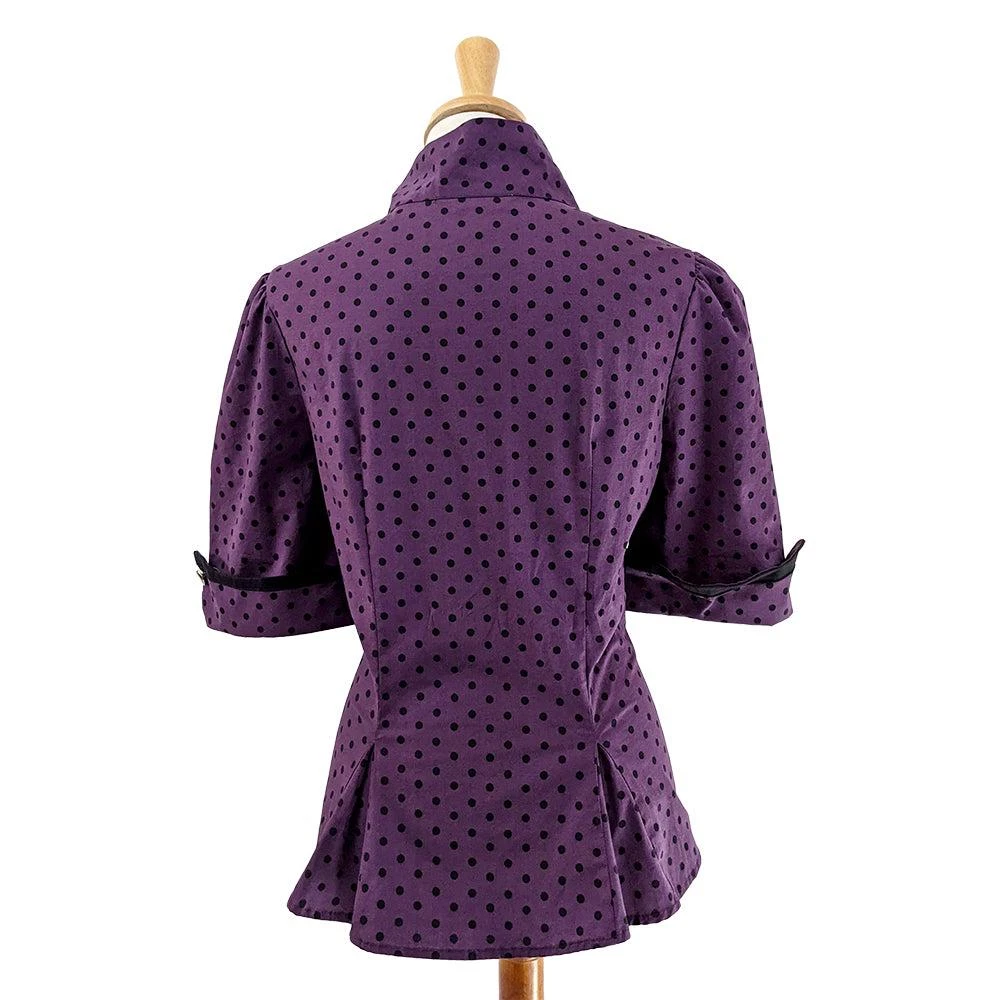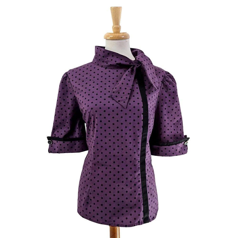 Liven up your library look in this unique retro-inspired top! The hidden front zipper closure is covered by the vertical black trim, all topped off with a tie neckline. Gently puffed sleeves end in an upturned cuff at about elbow length, trimmed in black and fastened with shiny black buttons. The fitted bodice flares into a vented waist for a flattering shape whether untucked or worn under your favorite swing skirt.Â