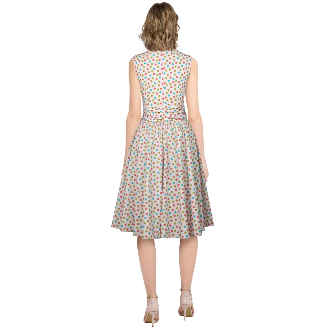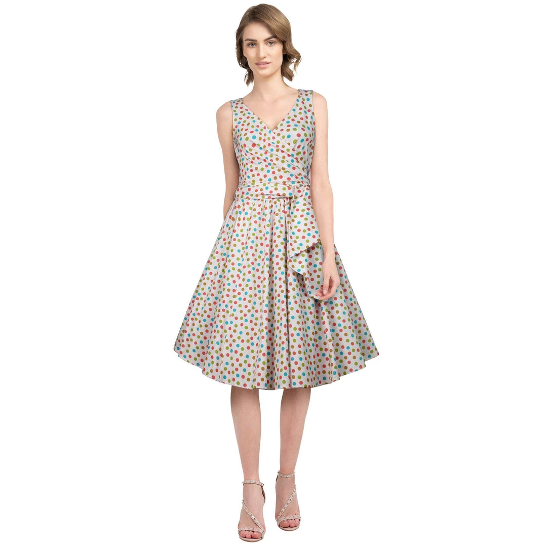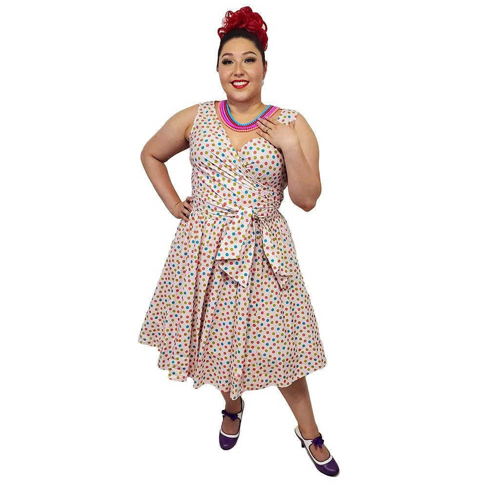 Oh my sweets!! This sweet playful dress features green, turquoise, olive, and light red polka dots on a creamy pink background. It features a lightly-gathered surplice bust that ties on the side for a customizable fit and an attached sash belt. Zips up the back.