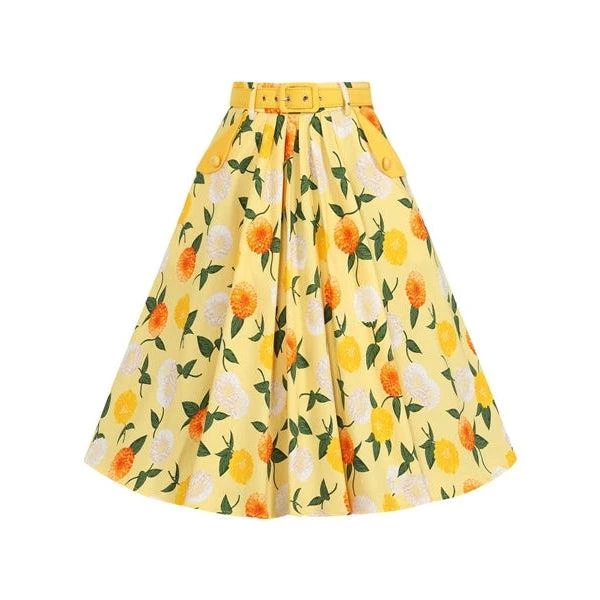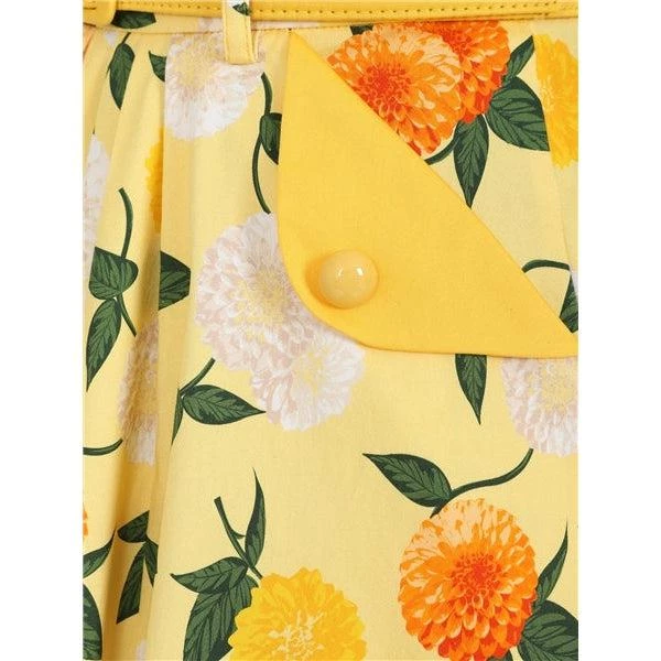 This vintage-inspired flared skirt from Collectif is a breath of fresh air!! The pastel yellow skirt is printed in bright orange and yellow marigolds. It has a high-waisted fit and is pleated at the front for shape. It has cute buttoned pockets with solid yellow flaps and a matching yellow buckled belt. At 25″ long, it falls just below the knee. Â