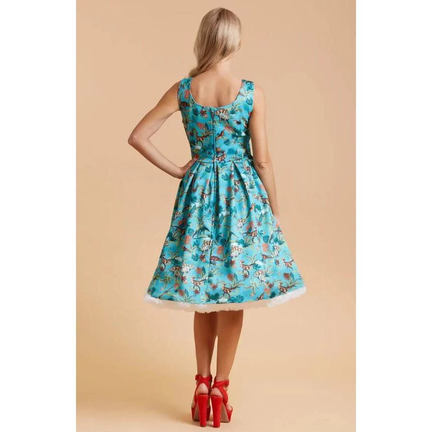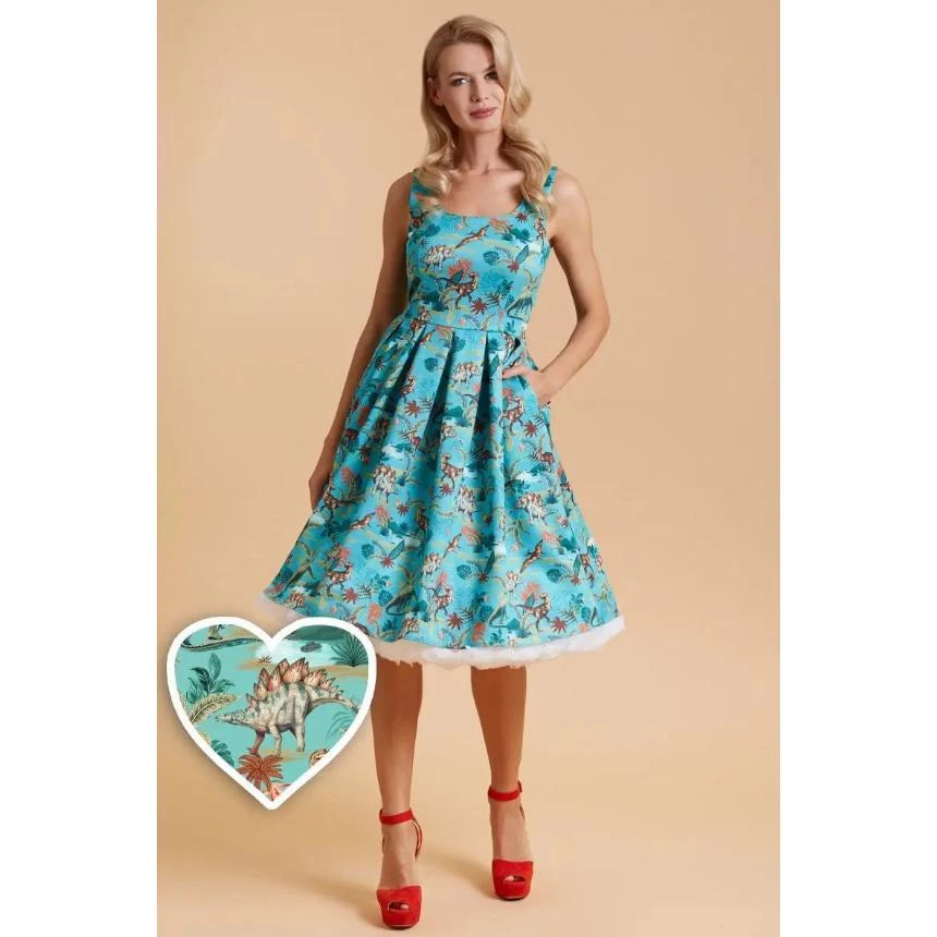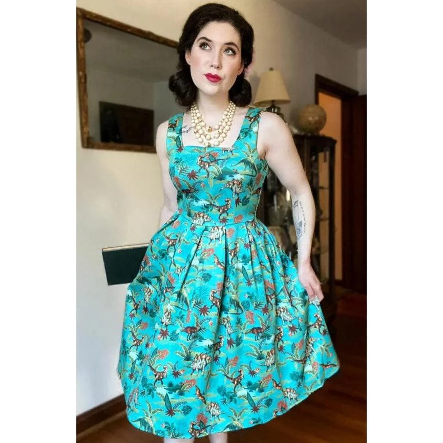 The Amanda dress from Dolly & Dotty is a gorgeous retro style dress cut to compliment curves! The frock features a flattering fitted bodice, simple scoop neckline at the front and back, and a 50s swing skirt with box pleats. It has two hidden side seam pockets and a concealed zipper at the back. Made in a super fun dinosaur print on a turquoise blue background.