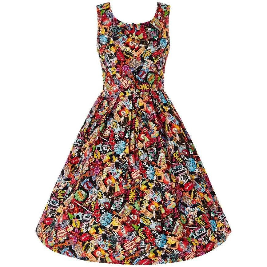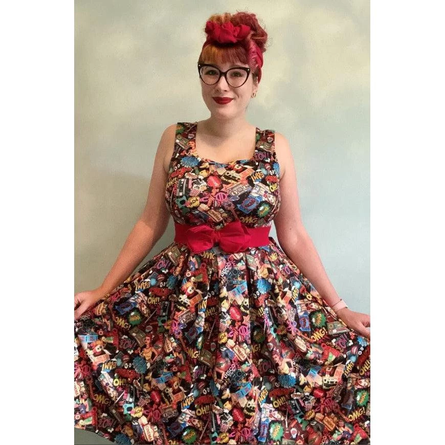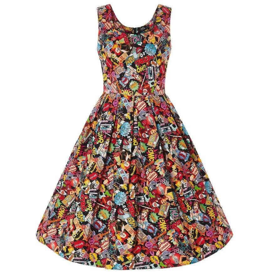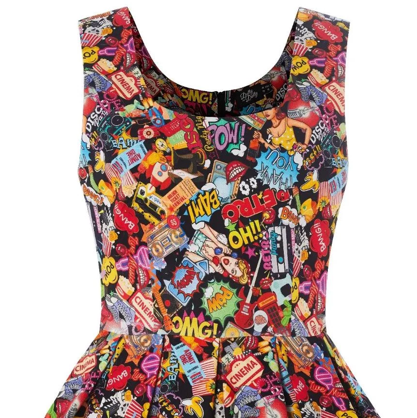 The Amanda dress from Dolly & Dotty has some real “RETRO POW!!” to it. It’s a gorgeous retro style dress cut to compliment curves! The frock features a flattering fitted bodice, simple scoop neckline at the front and back, and a 50s swing skirt with box pleats. It has two hidden side seam pockets and a concealed zipper at the back. The stunning Pop Art print is amazing, fun, and sure to get noticed!