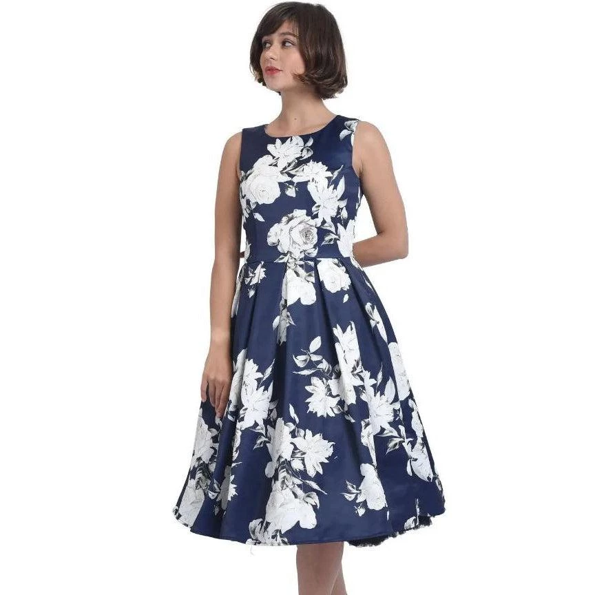 The Annie is a gorgeous pinup-girl-style dress from Dolly & Dotty that has been cut to compliment your curves! The retro frock features a lovely flattering fitted bodice, a simple bateau neckline, a 50s full circle swing skirt with box pleats, and it has side seam pockets. Made from a lovely chintz print with white roses on a navy blue background, this dress has a smooth and fabulous fit.