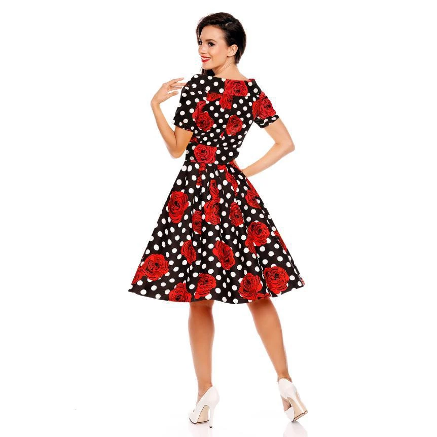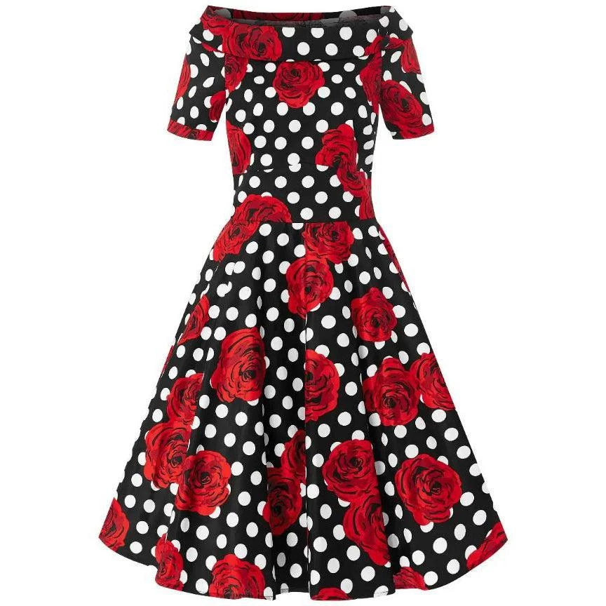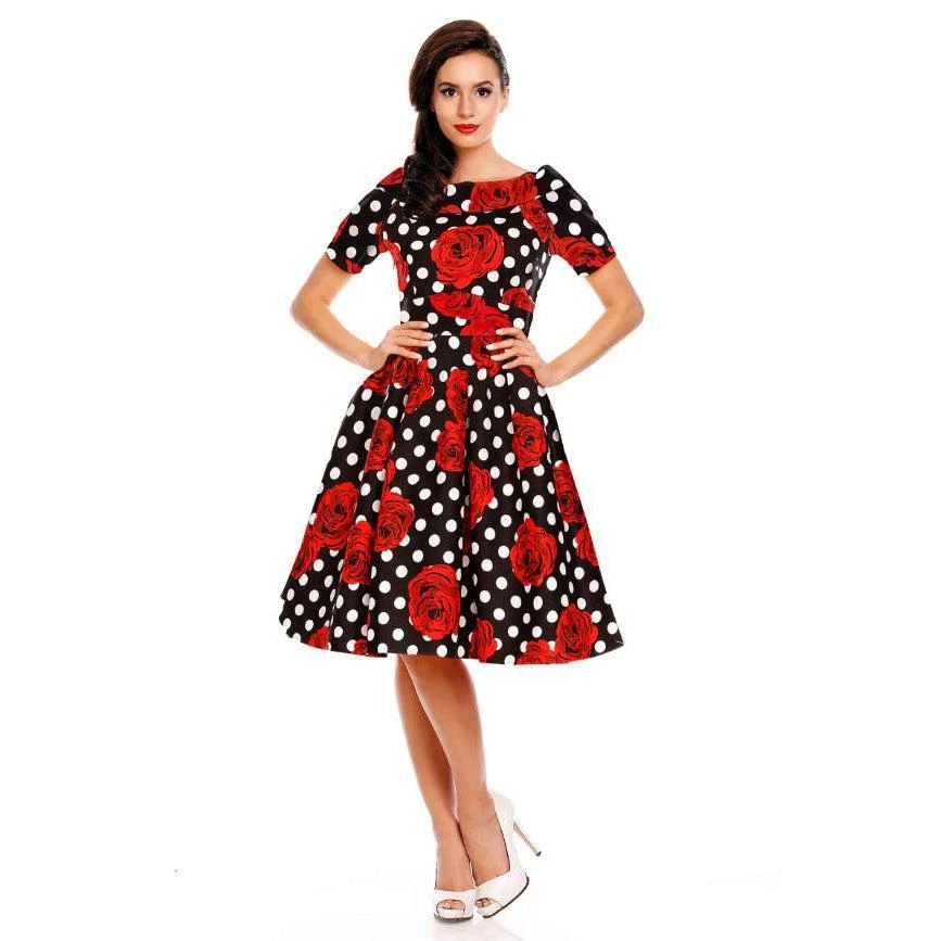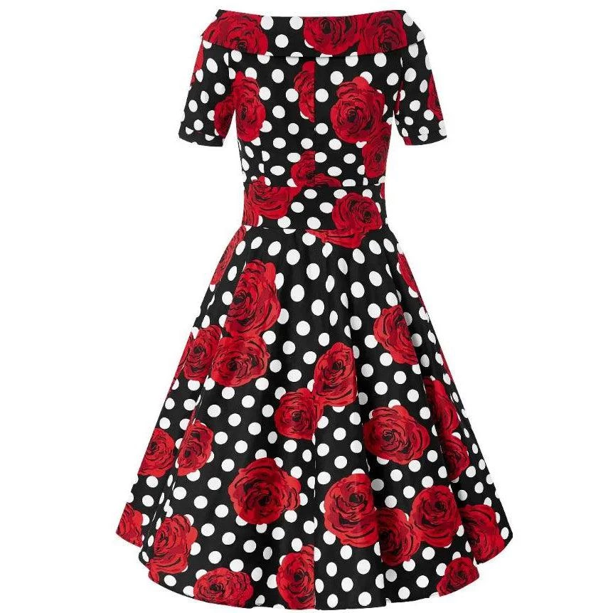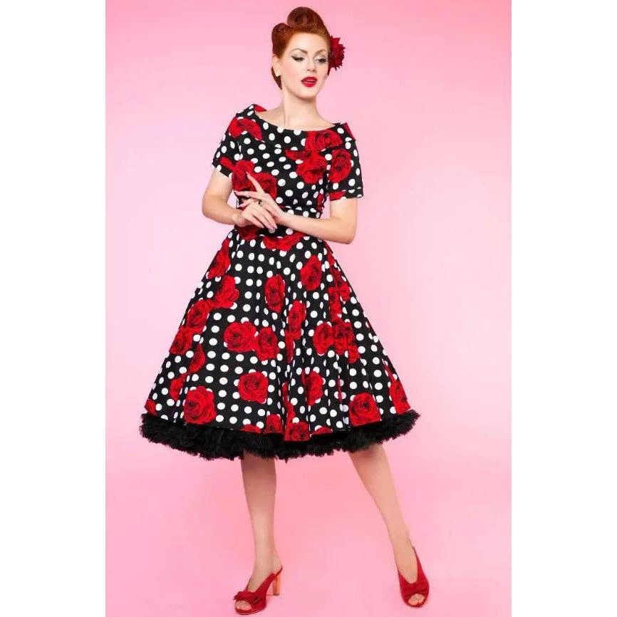 The Darlene dress from Dolly & Dotty is a wonderfully versatile 50’s style swing dress, perfect for any occasion! It features flattering short sleeves, a wide fitted waistband, vintage full circle skirt and a slightly off the shoulder neckline with button detail. This rockabilly frock is made in an eye-popping print of white polka dots and red roses on a black background. It fastens with a concealed side zipper.