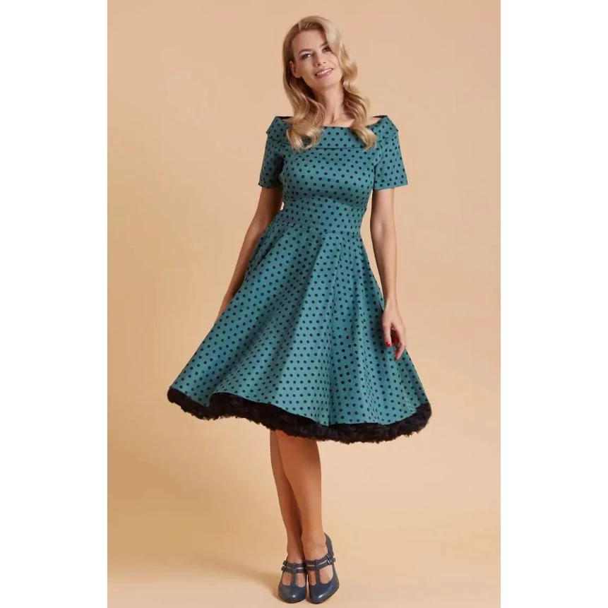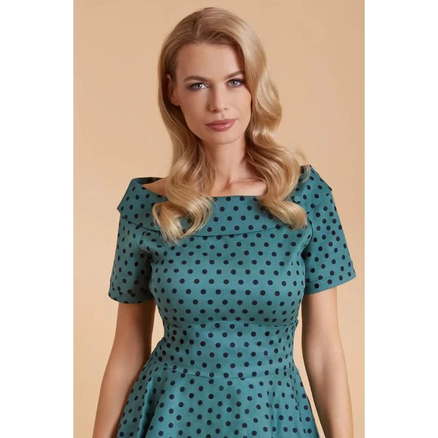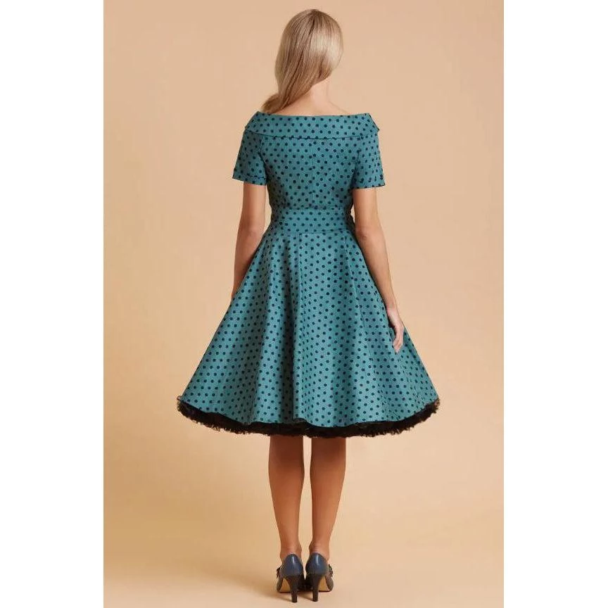 The Darlene dress from Dolly & Dotty is a wonderfully versatile 50’s style swing dress, perfect for any occasion! It features flattering short sleeves, a wide fitted waistband, vintage full circle skirt and a slightly off the shoulder neckline with button detail. This rockabilly frock is made in a dark green with black polka dot print. It fastens with a concealed side zipper.