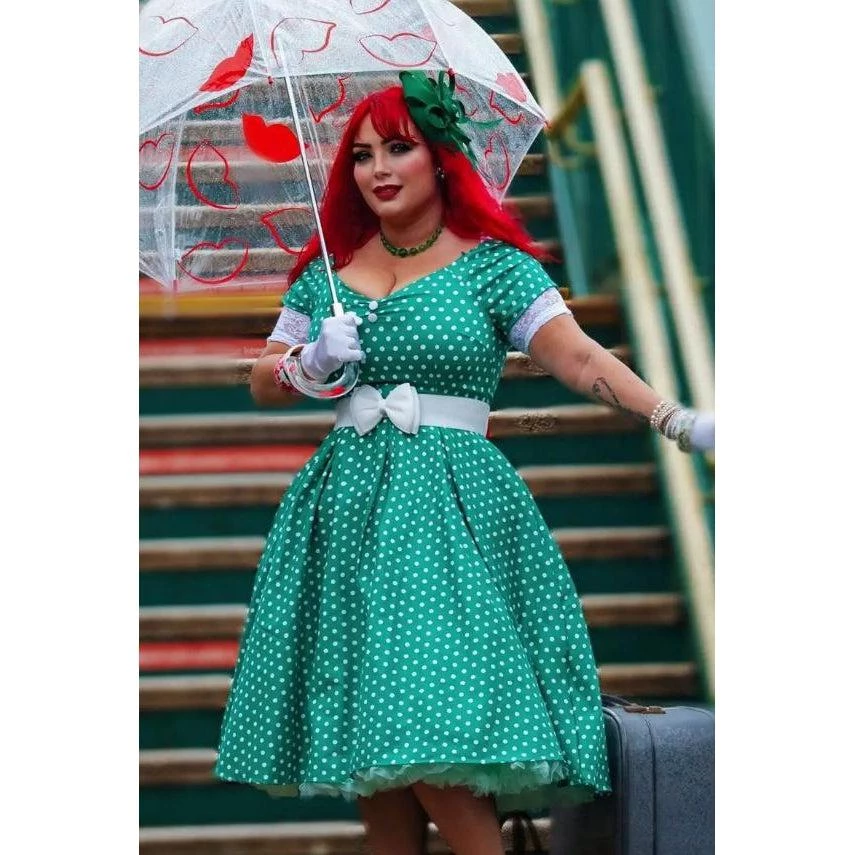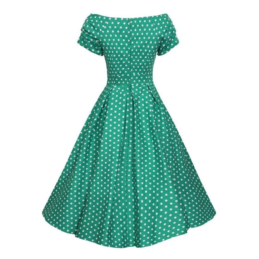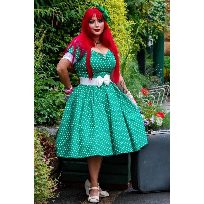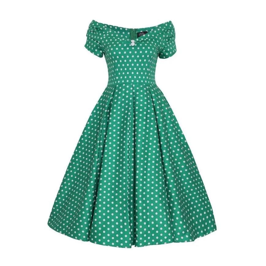 The Lily dress from Dolly & Dotty is a vintage wardrobe essential! This seductively gorgeous swing dress has a beautiful off the shoulder neckline, a pretty gathered bust with button detailing, a flattering fitted waist, two hidden side pockets and a 50s style pleated, flared skirt. Made from lovely soft cotton in glorious green with white polka dots, it has plenty of stretch and it fastens at the back with a hidden zipper.