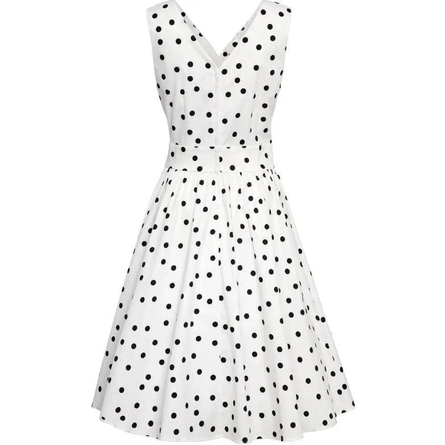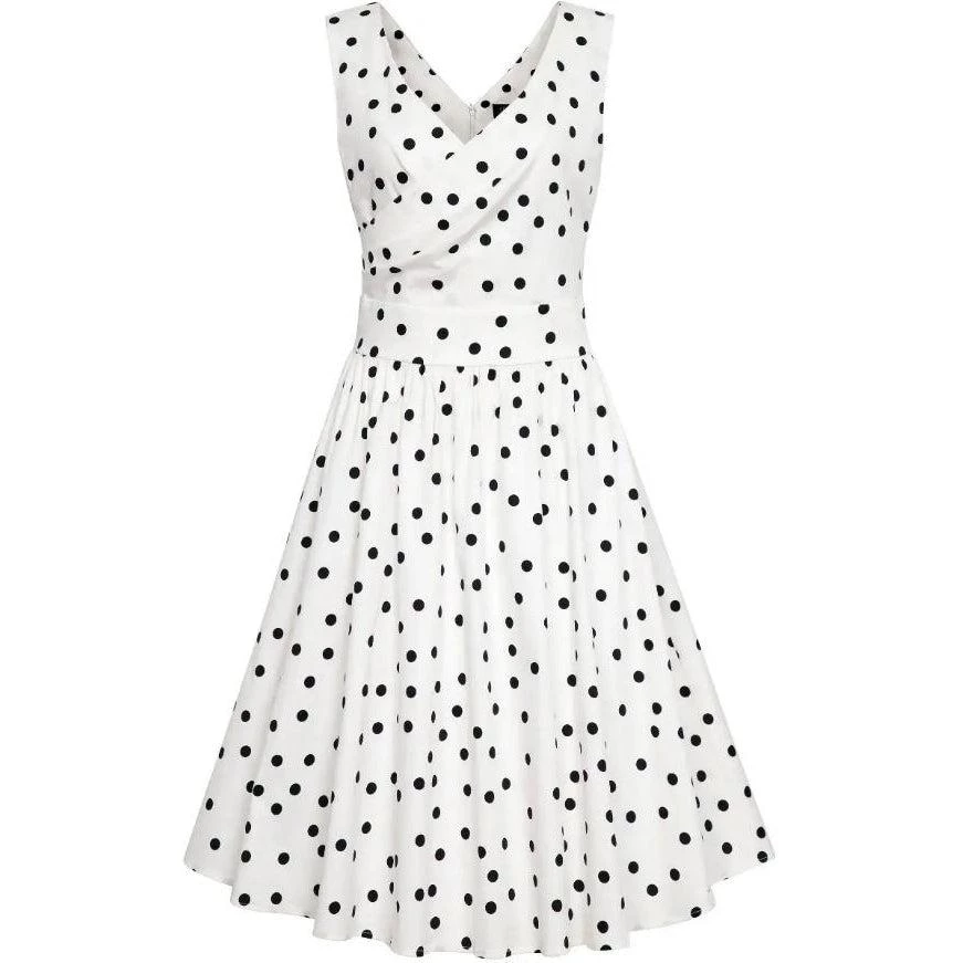 The May dress from Dolly & Dotty is a vintage-inspired dress perfect for creating that 50s pinup silhouette! It features a flattering V-neck crossover bust, fitted waistband, 50s full skirt and a concealed back zipper.