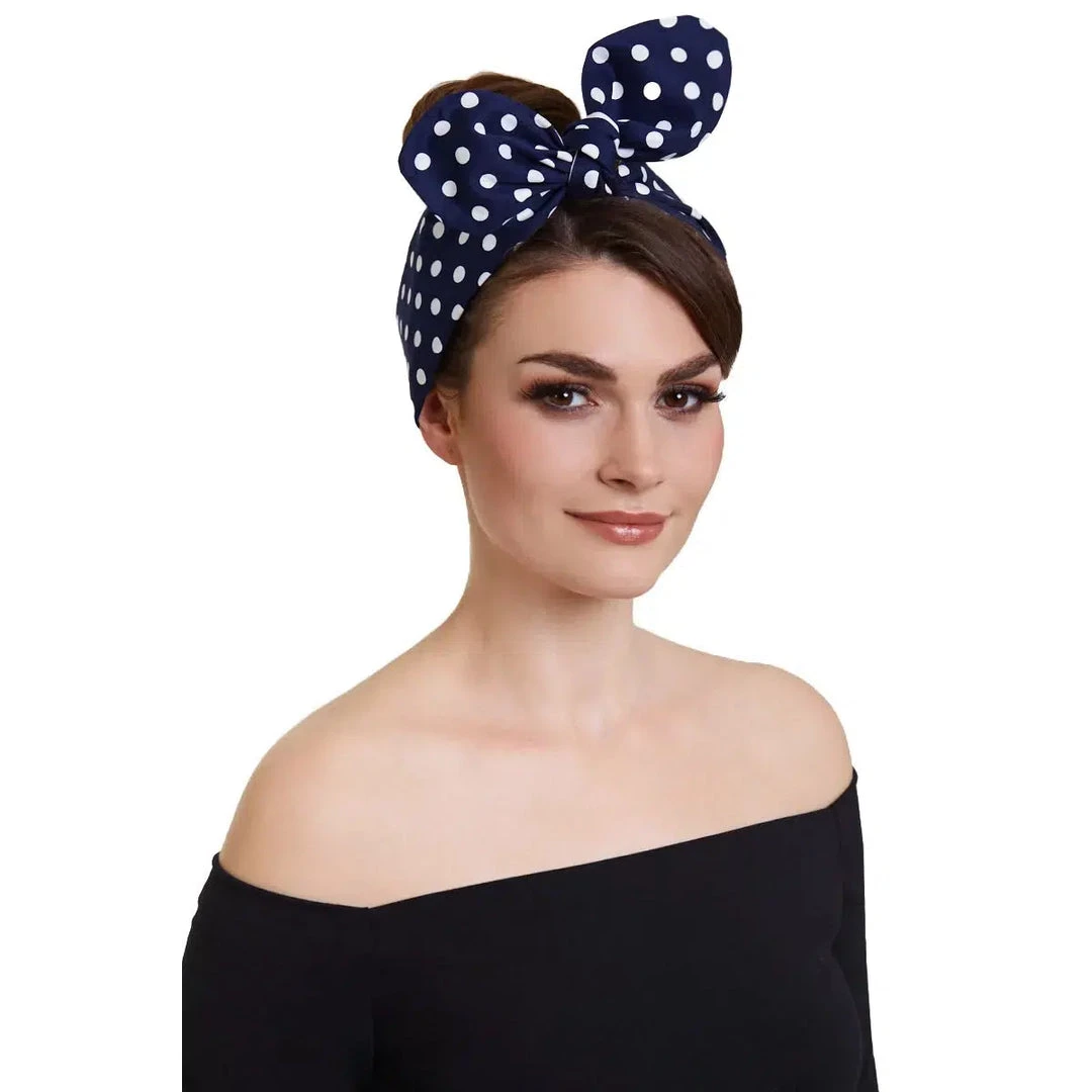 Instantly create a retro rockabilly look with this vintage style Navy and White Polkadot headband! Made from soft, stretchy fabric, this super cute hair band can easily be tied into a stylish classic knot. Yes, it is reversible, so you can turn it inside out for a fresh look!!