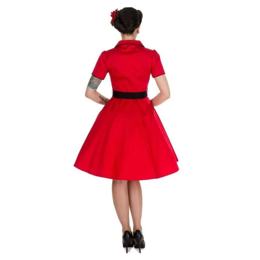 This 1950’s diner dress from Dolly & Dotty has a serious rockabilly girl attitude. The Penelope Shirt Dress captures the spirit of the 1950s pinup style perfectly! It has a flattering fitted top with short sleeves, cute buttons, and a retro-style collar. The vintage-style dress comes with a cute contrasting black belt and piping details. It fastens with a concealed side zipper.Â