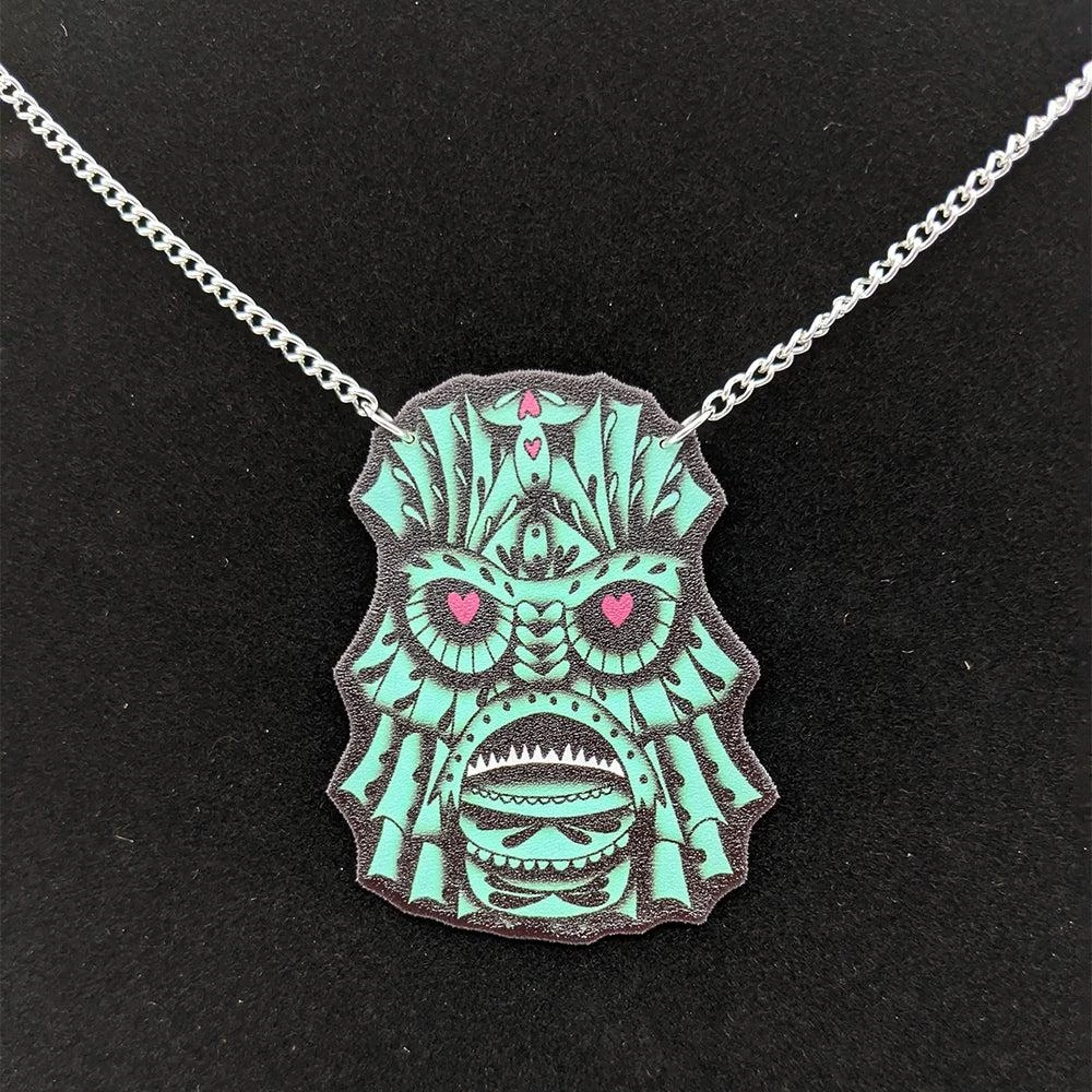 We’re super excited to carry these handmade 40’s & 50’s-inspired designs by UK artist Dolly Cool. This necklace features the iconic creature from the Black Lagoon. Charm measures approx. 1.5″ wide by 1.5″ high, and is attached to an 18″ low-nickel, silver-plated chain. The design is hand drawn and coloured by the artist, then cut and sealed with varnish for protection.