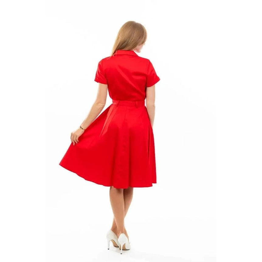 This shirtwaist dress from Eva Rose has quintessential mid-century styling. It has short, cuffed sleeves, a classic shirt collar, and buttons up the front. The bodice has pretty princess seams for great fit, and the skirt is fantastically flared. It has side seam pockets and there are belt loops front and back with a matching sash-type belt to tie in the front. The fire-engine red fabric is smooth and sturdy, a high-quality cotton spandex fabric that is breathable and easy to maintain.