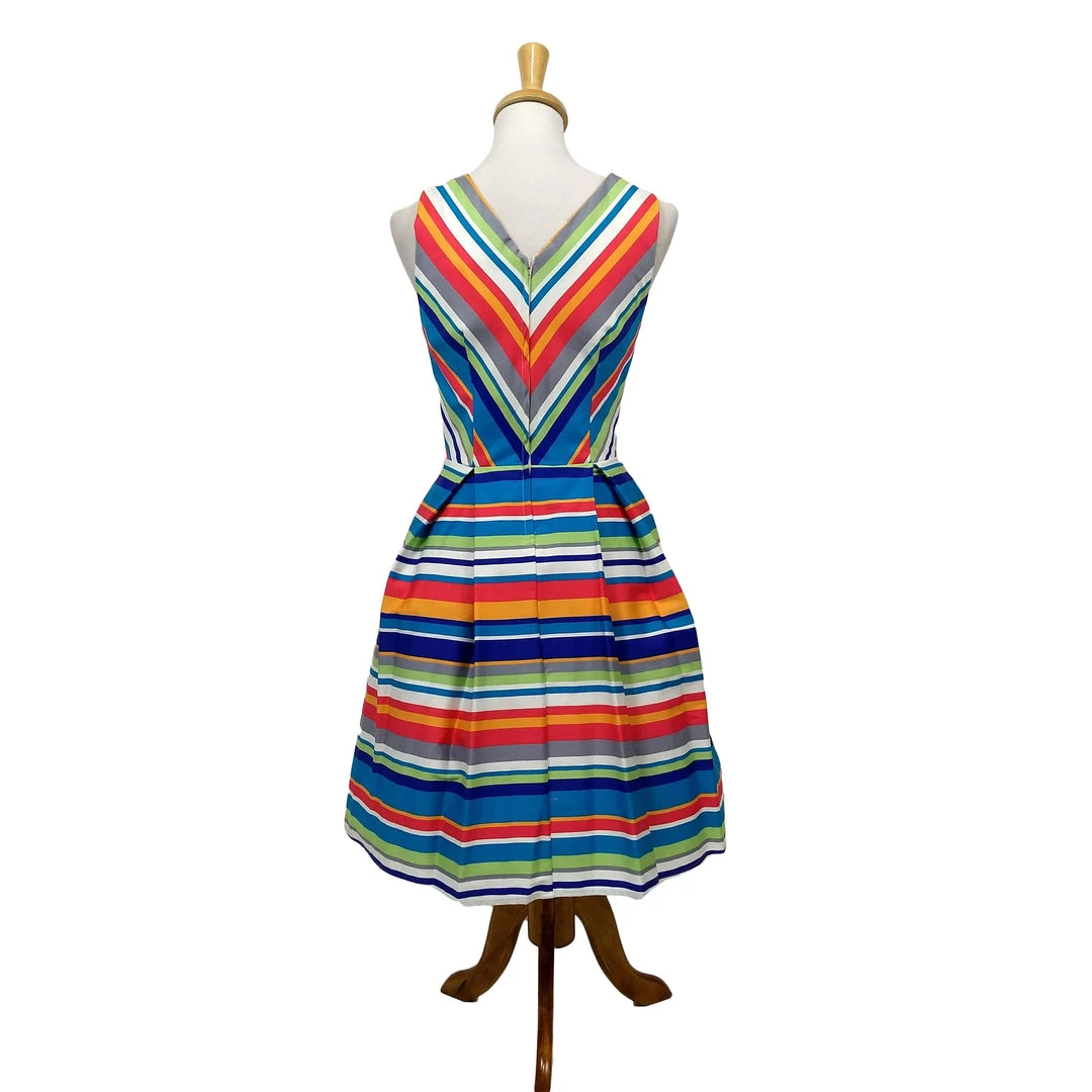 Brilliant rainbow colors create a visual feast of stripes in this gorgeous sleeveless swing dress. The V-neckline is formed of perfectly matched chevron stripes that are so figure-flattering. The beautifully pleated full skirt and the back and sides of the bodice feature horizontal rainbow stripes juxtaposed against the front chevron. The fabric has nice stretch and a supple feel. It has side seam pockets and zips up the back. This fabulous dress will take you over the rainbow!!