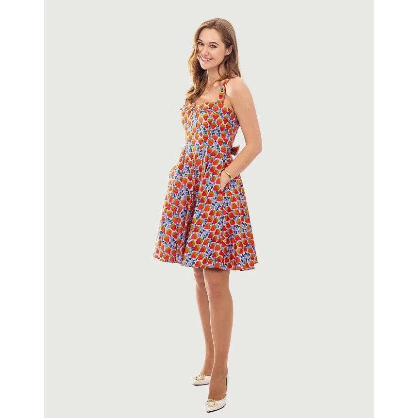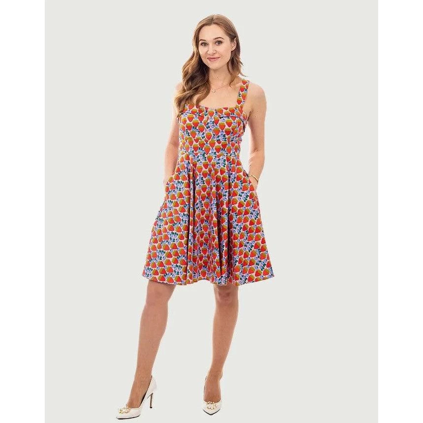 This is a berry pretty dress from Eva Rose! It’s made of a supple and sturdy fabric with bushels of strawberries and blueberries printed on a pink background. It has a fold-over sweetheart neckline that sits atop hidden cups that offer a little extra support and shaping. The dress has wide straps, elastic at the back edge of the dress, an attached sash belt to tie in the back, and a fabulously full swing skirt. It has side seam pockets and zips up the back. Â
