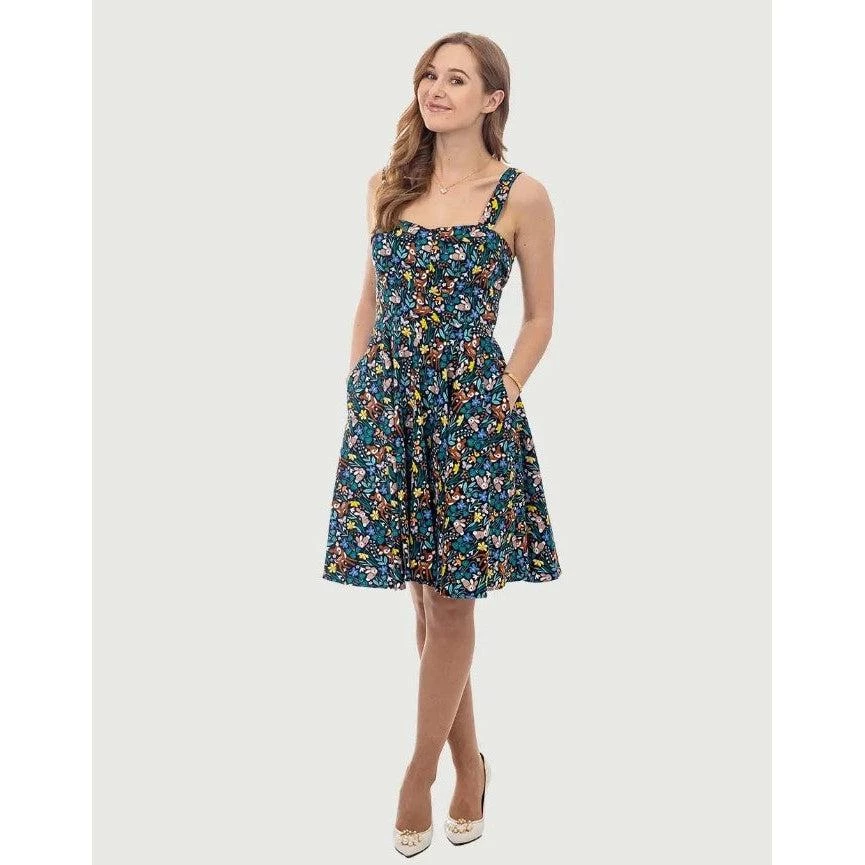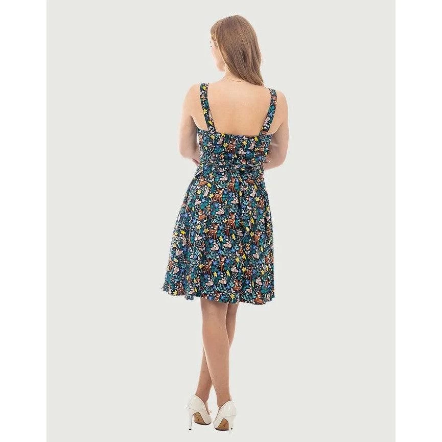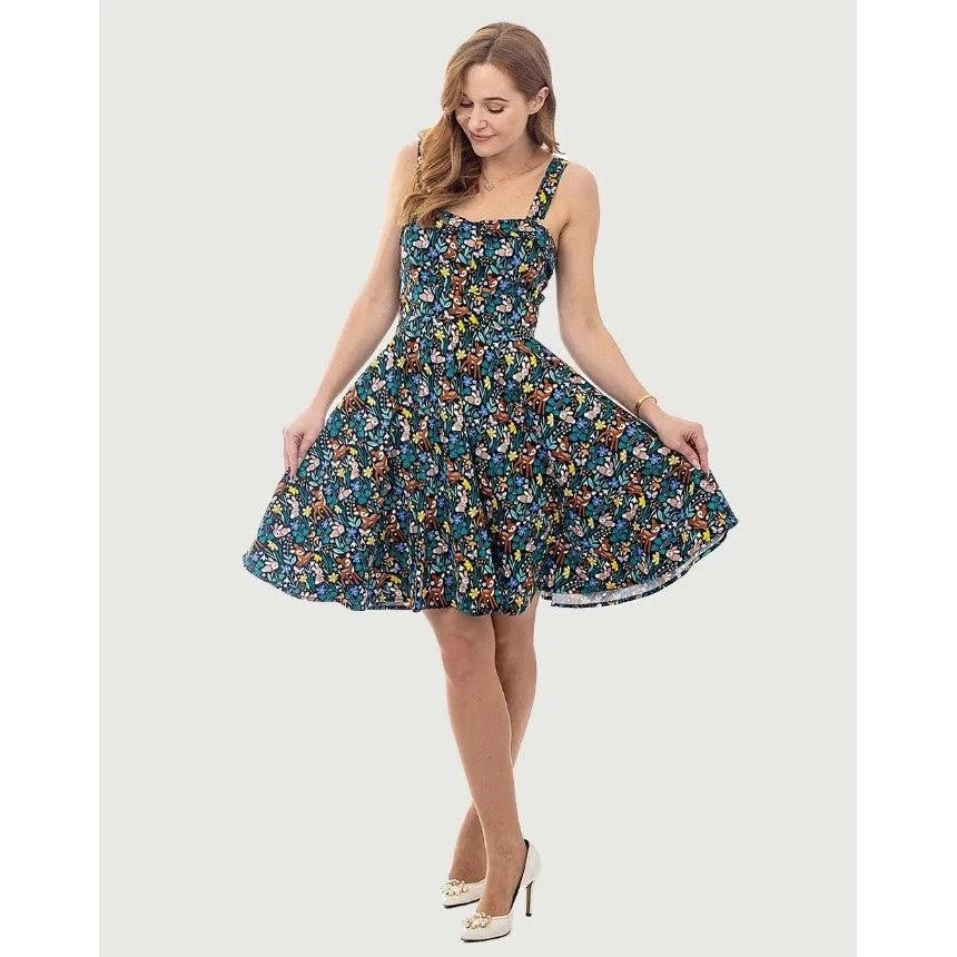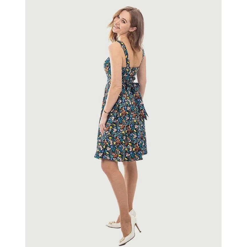 Oh, deer! This fun piece from Eva Rose is made of a supple and sturdy fabric with baby deer and rabbits frolicking through a floral woodland. It has a fold-over sweetheart neckline that sits atop hidden cups that offer a little extra support and shaping. The dress has wide straps, elastic at the back edge of the dress, an attached sash belt to tie in the back, and a fabulously full swing skirt. It has side seam pockets and zips up the back. So sweet!!